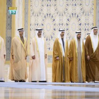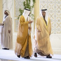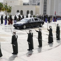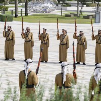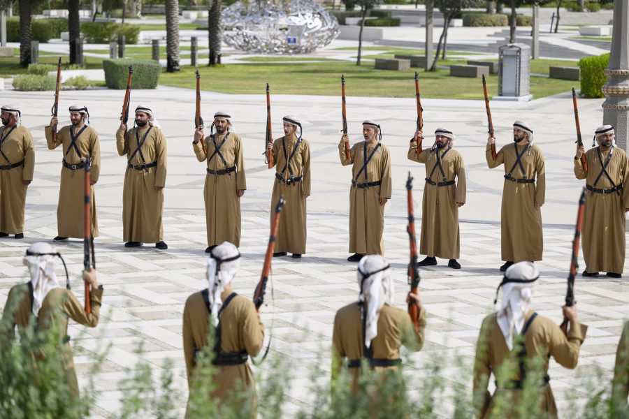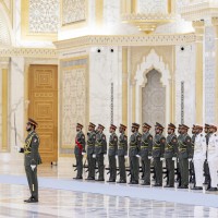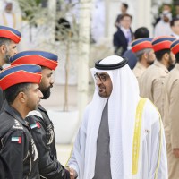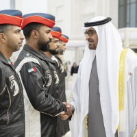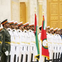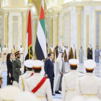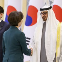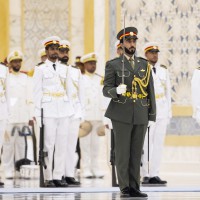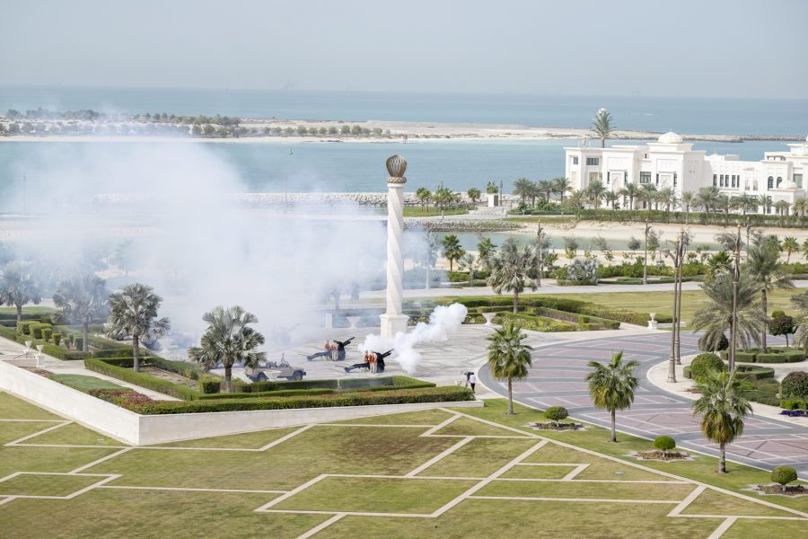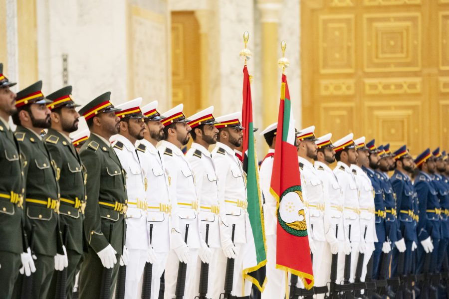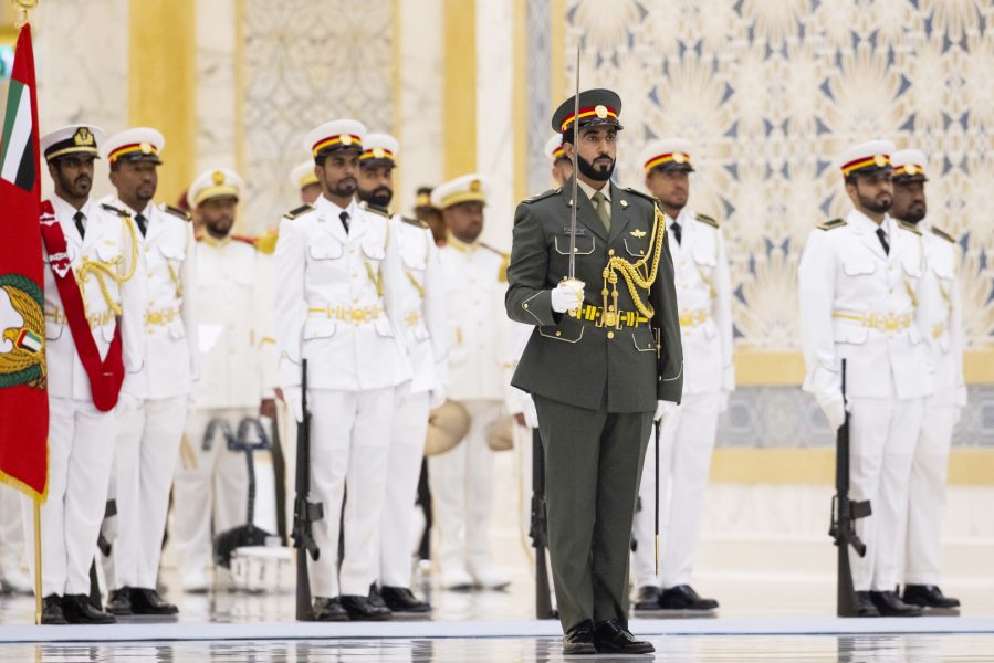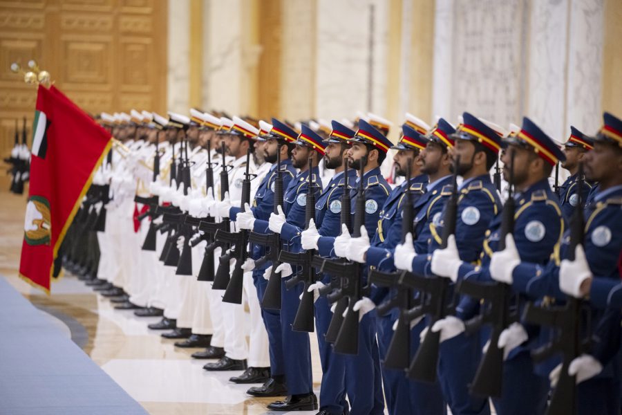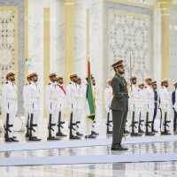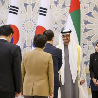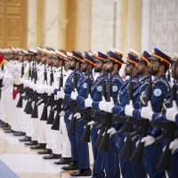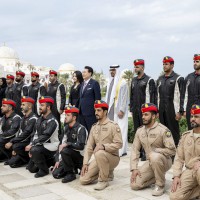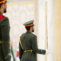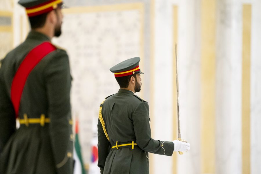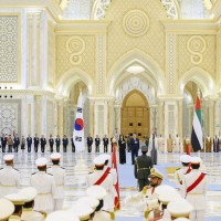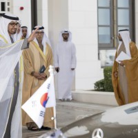 واصطحب صاحب السمو الشيخ محمد بن زايد آل نهيان الرئيس الضيف إلى منصة الشرف وعزف السلام الوطني لكوريا فيما أطلقت المدفعية 21 طلقة واصطفت ثلة من حرس الشرف تحية لفخامته.