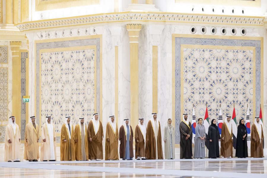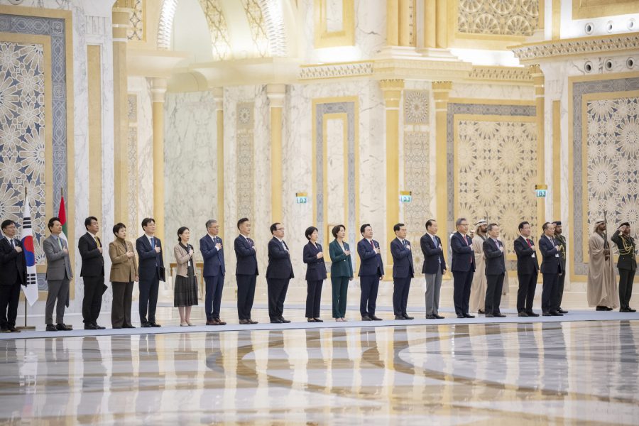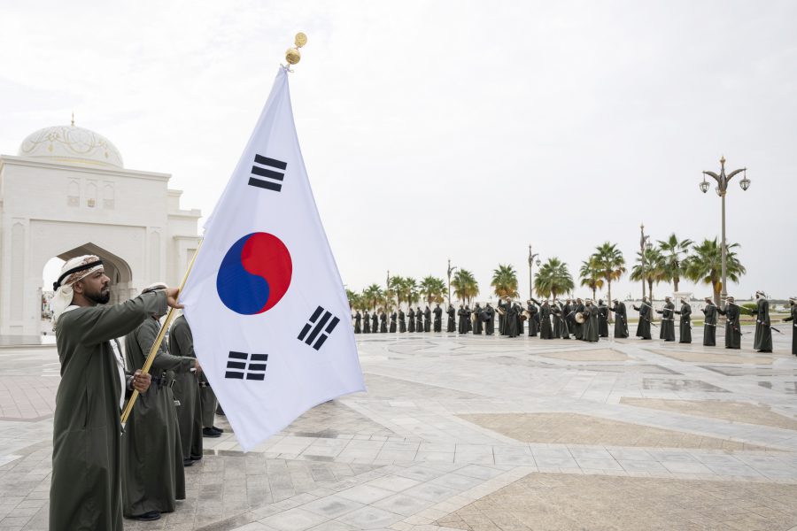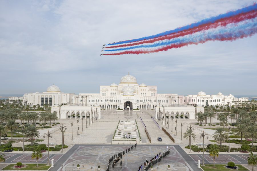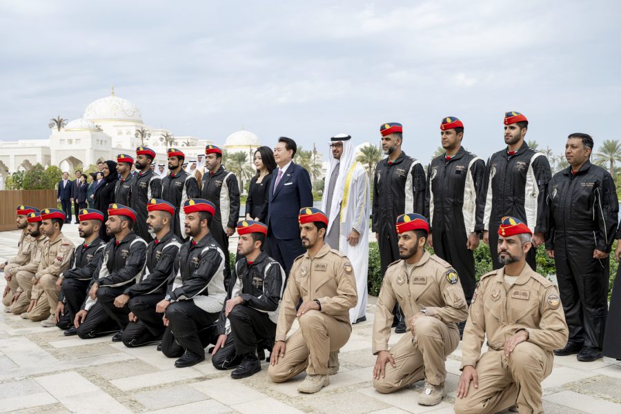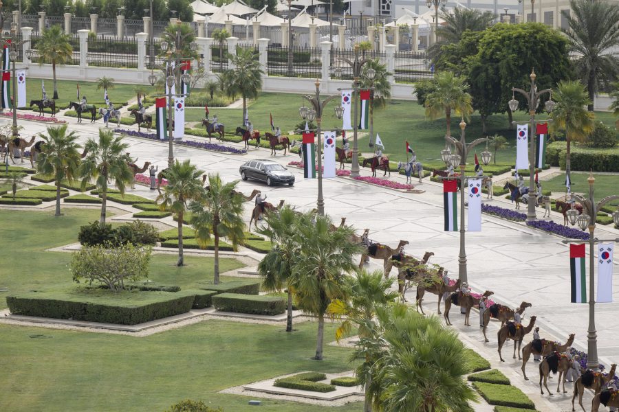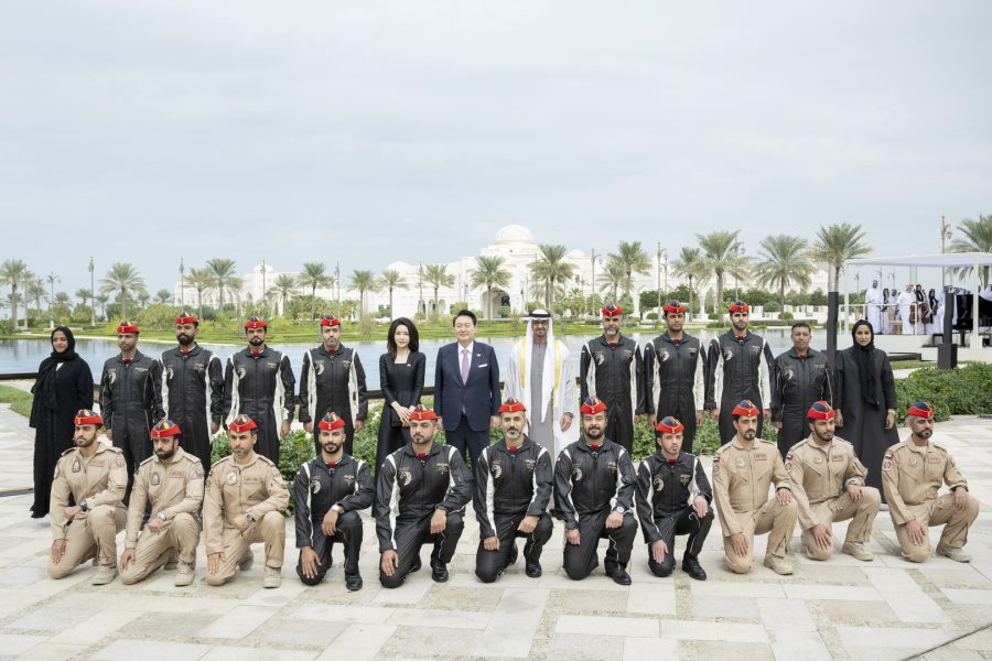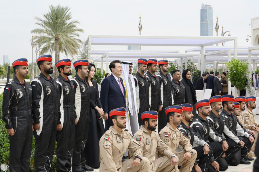 وقبيل وصول موكب الرئيس الكوري إلى ساحة القصر حلق فريق “فرسان الإمارات” الوطني للاستعراضات الجوية في سماء القصر مشكلاً لوحة بعلم كوريا.