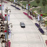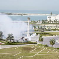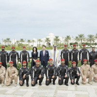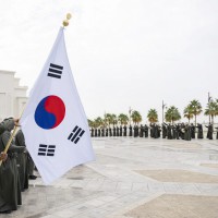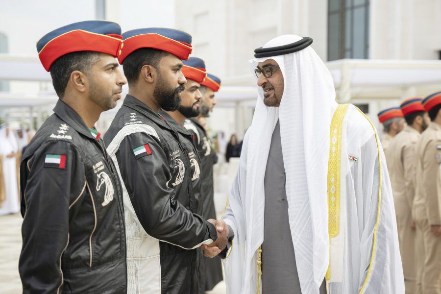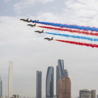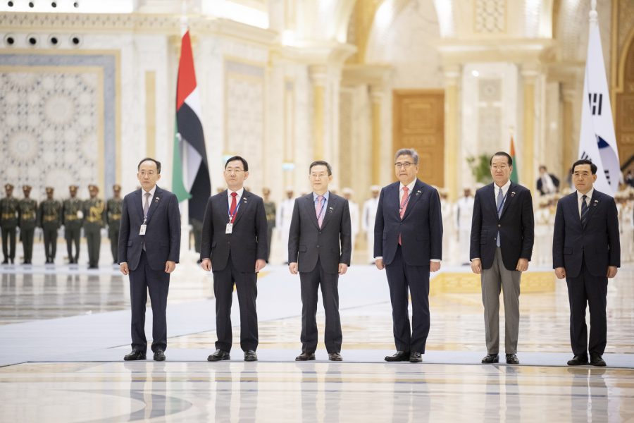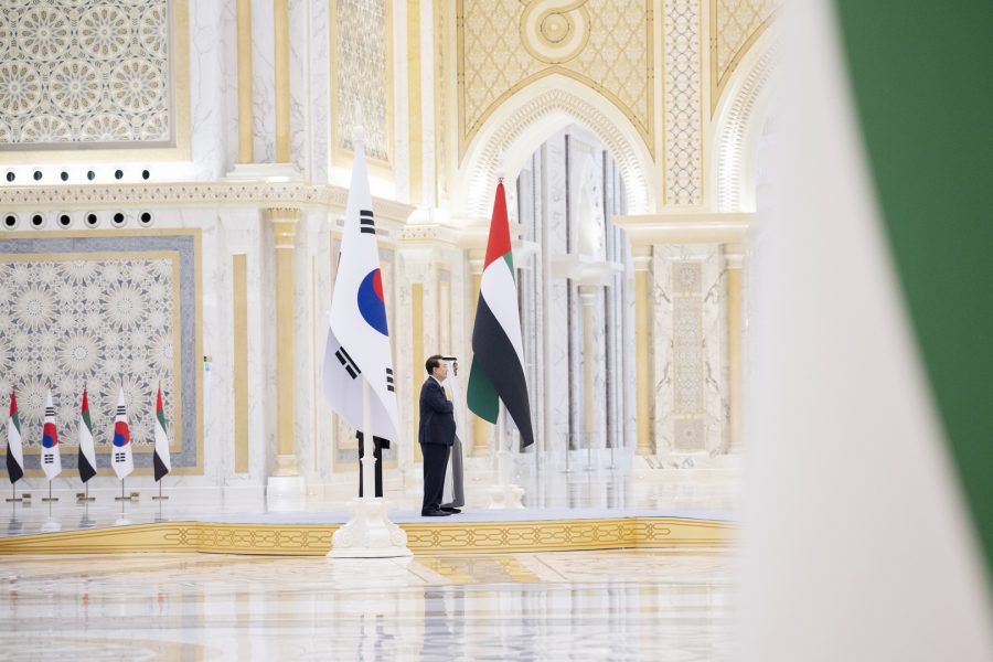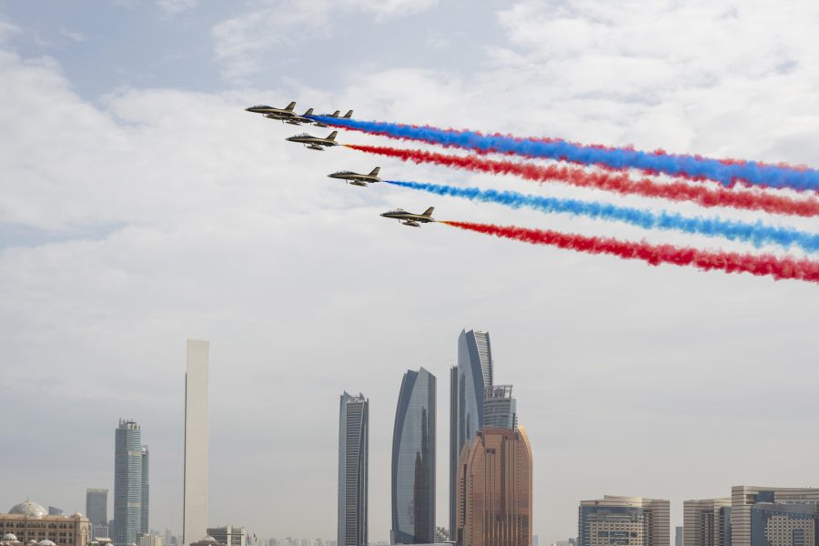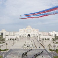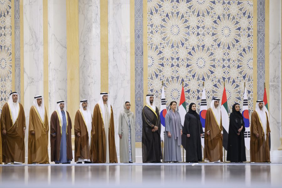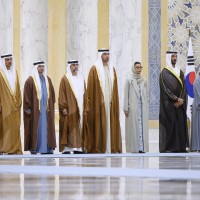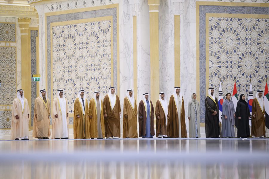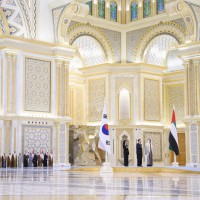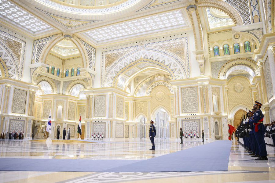 وقبيل وصول موكب الرئيس الكوري إلى ساحة القصر حلق فريق “فرسان الإمارات” الوطني للاستعراضات الجوية في سماء القصر مشكلاً لوحة بعلم كوريا.
