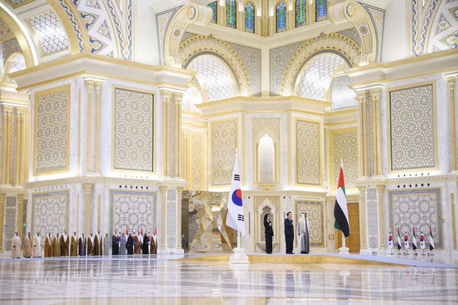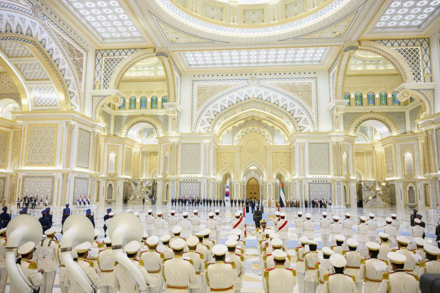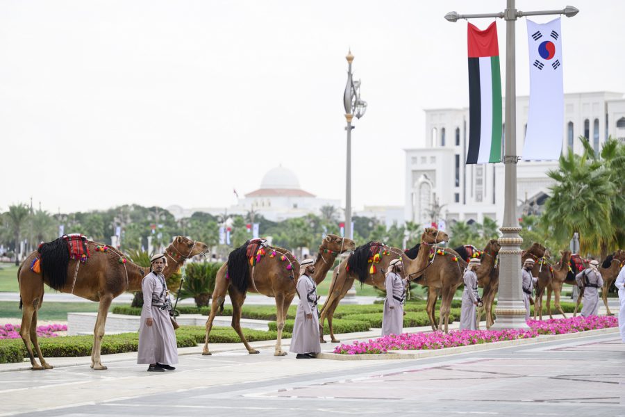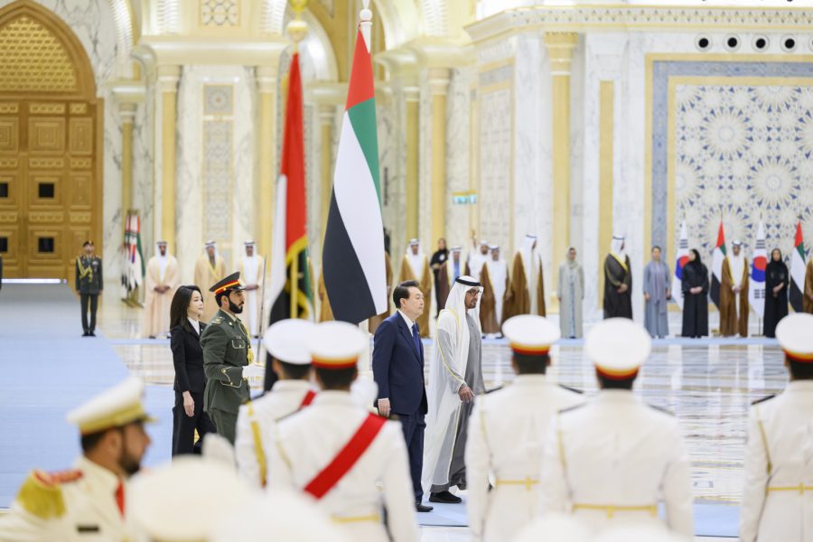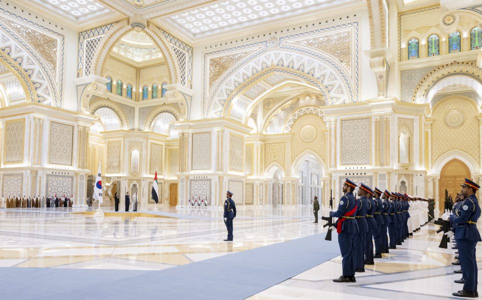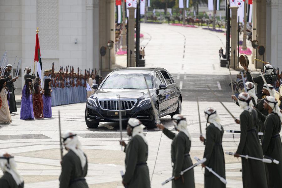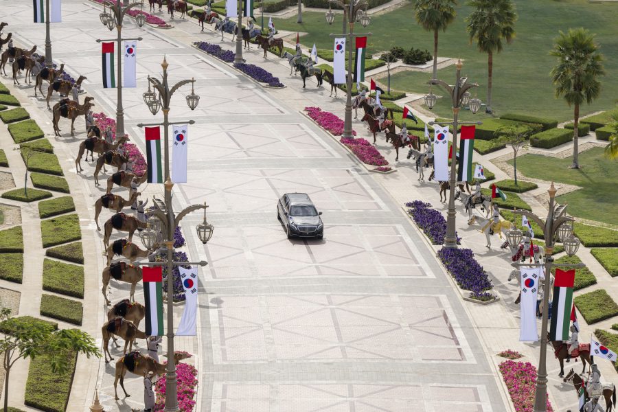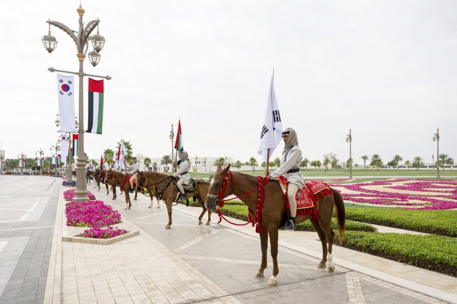 وجرت لفخامة الرئيس يون سيوك يول مراسم استقبال رسمية لدى وصول موكبه قصر الوطن في العاصمة أبوظبي ترافقه مجموعة من الفرسان على صهوات الخيول العربية الأصيلة.
