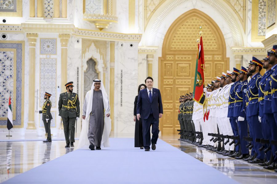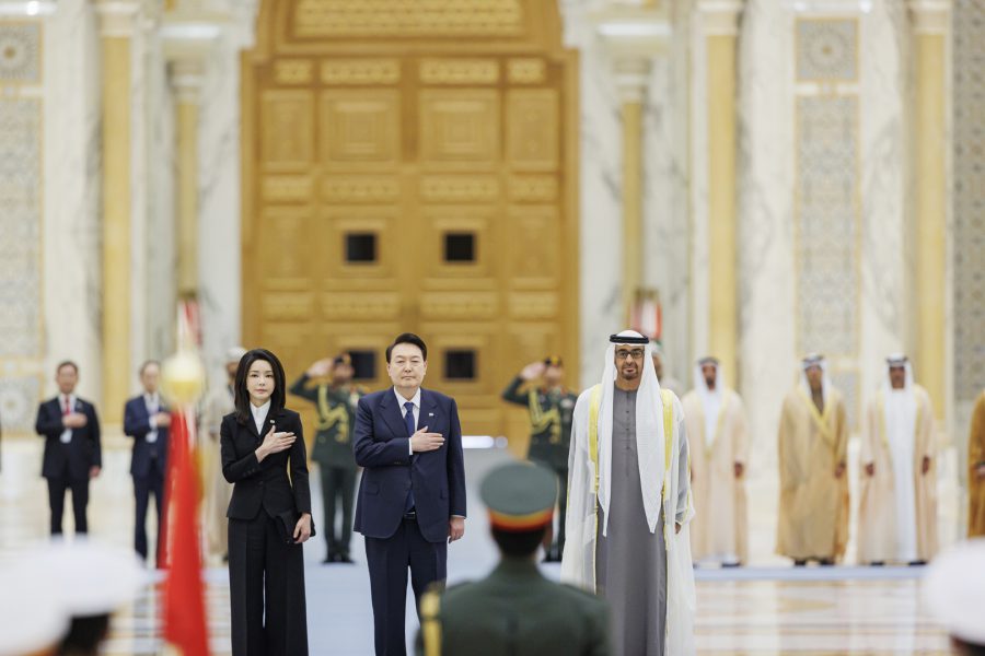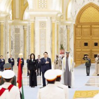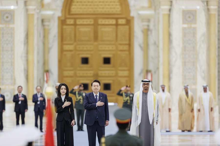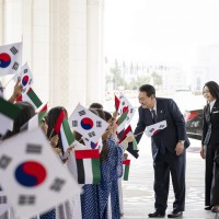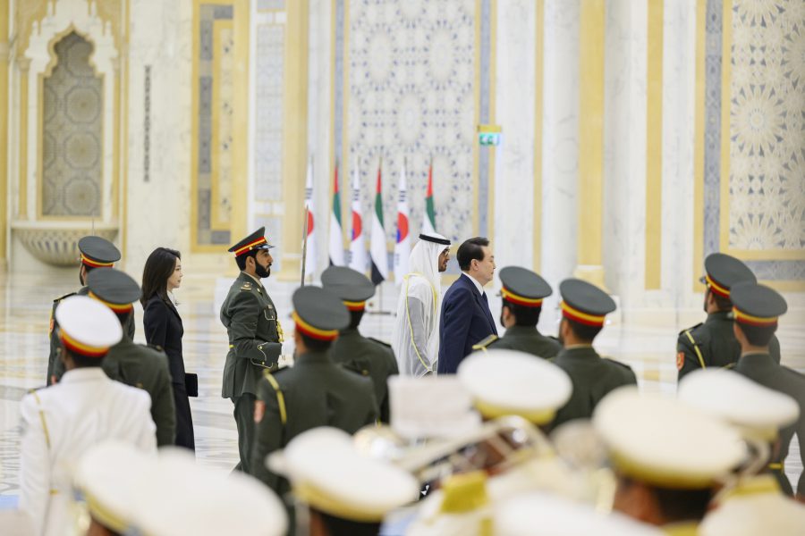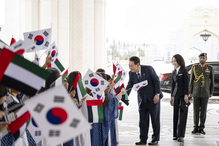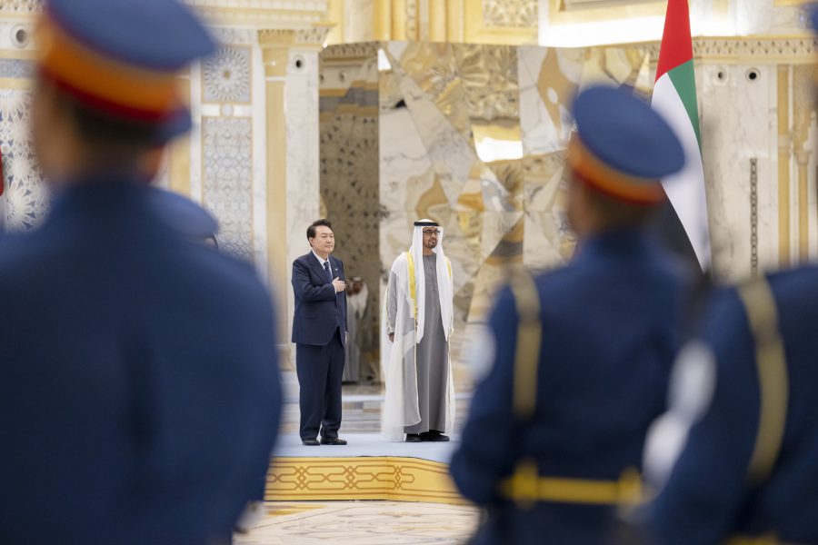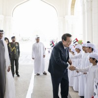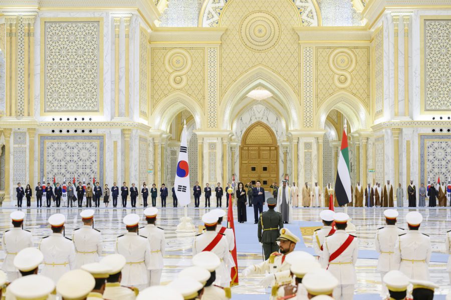وجرت لفخامة الرئيس يون سيوك يول مراسم استقبال رسمية لدى وصول موكبه قصر الوطن في العاصمة أبوظبي ترافقه مجموعة من الفرسان على صهوات الخيول العربية الأصيلة.