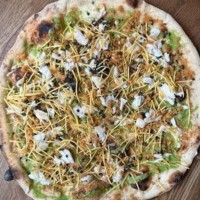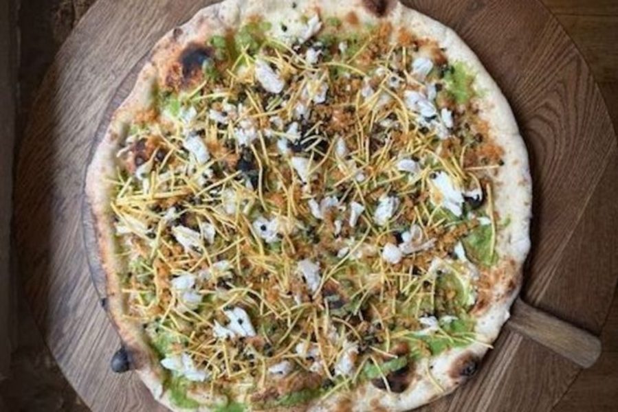 تشمل الطبقة العلوية لفطيرة البيتزا التي يبلغ مقاسها 20 بوصة، على الملح والخل المقدد، وهريس البازلاء، والرقائق المقرمشة، وحفنة من شرائح السمك.