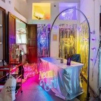 وبدا “بيت 45” منصة لعرض مجموعة من الأعمال الفنية التركيبية وعلى رأسها عمل “حفظ لوني” للفنان اللبناني أحمد مكاري الذي سعى من خلاله لتكريم المهندس المعماري العالمي لويس باراجان، ويتكون العمل من نسيج لوني يغطي بعض زوايا “بيت 45” بينما يقدم السويسري ماكسيم كرامات عمله التفاعلي “اعتدت أن أنام ليلاً” وهو عبارة عن إضاءة ثلاثية الأبعاد تشكل تجربة فنية غامرة.