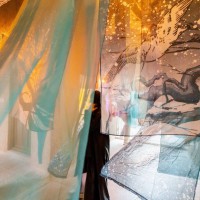 ومن “خلف الزجاج” يطل البريطاني صموئيل ويليام واينرايت حيث يستند في عمله هذا على التفاعل بين الضوء والظل لتوفير الإحساس بالحركة؛ وباستخدام الأقمشة ورذاذ الطلاء والحبر ابتكر الماليزي غاري يونغ عمله “منتصف الليل عبر الغابة” الذي يبدو أشبه بممر من الأنسجة المنسجمة مع أعمال فنية مستلهمة من الطبيعة.
