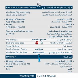 كما يمكن للمتعاملين مواصلة الحصول على خدمات المركز عن طريق المنصات الرقمية المتاحة على موقعه الإلكتروني www.itc.gov.ae، وتطبيقات “درب” و”دربي” للهواتف الذكية ومنصة “تم” للخدمات الحكومية الرقمية، وعبر التواصل مع مركز دعم الخدمات لدائرة البلديات والنقل على الرقم المجاني 800850، ومركز اتصال خدمة مركبات الأجرة 600535353، على مدار الساعة طوال أيام الأسبوع.