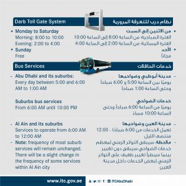 وفيما يتعلق بخدمة حافلة عند الطلب “أبوظبي لينك”، ستعمل هذه الخدمة حسب الجدول الحالي من الساعة 6:00 صباحاً إلى الساعة 11:00 مساءً طوال أيام الأسبوع.