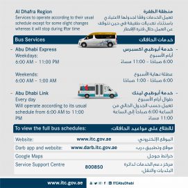 وللاطلاع على مواعيد الحافلات النقل العام، يرجى زيارة الموقع الإلكتروني للمركز www.itc.gov.ae أو التواصل مع مركز دعم الخدمات لدائرة البلديات والنقل على الرقم المجاني 800850 أو عبر تطبيق “دربي” الذكي.