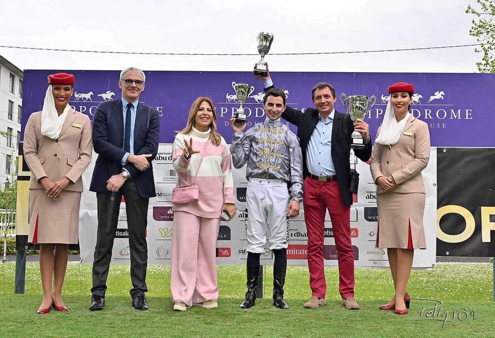 وتوّجت لارا صوايا المدير التنفيذي لمهرجان سباقات سمو الشيخ منصور بن زايد آل نهيان، الفائزين بالسباق الذي جري لمسافة 2000 متر، والبالغ جائزته 30 ألف يورو، وأكدت أنه يعد من أكبر السباقات في انطلاقة الموسم في فرنسا حيث تم تصنيفه من الفئة الثانية، وجاء قوياً ومثيراً في صراع المهرات.