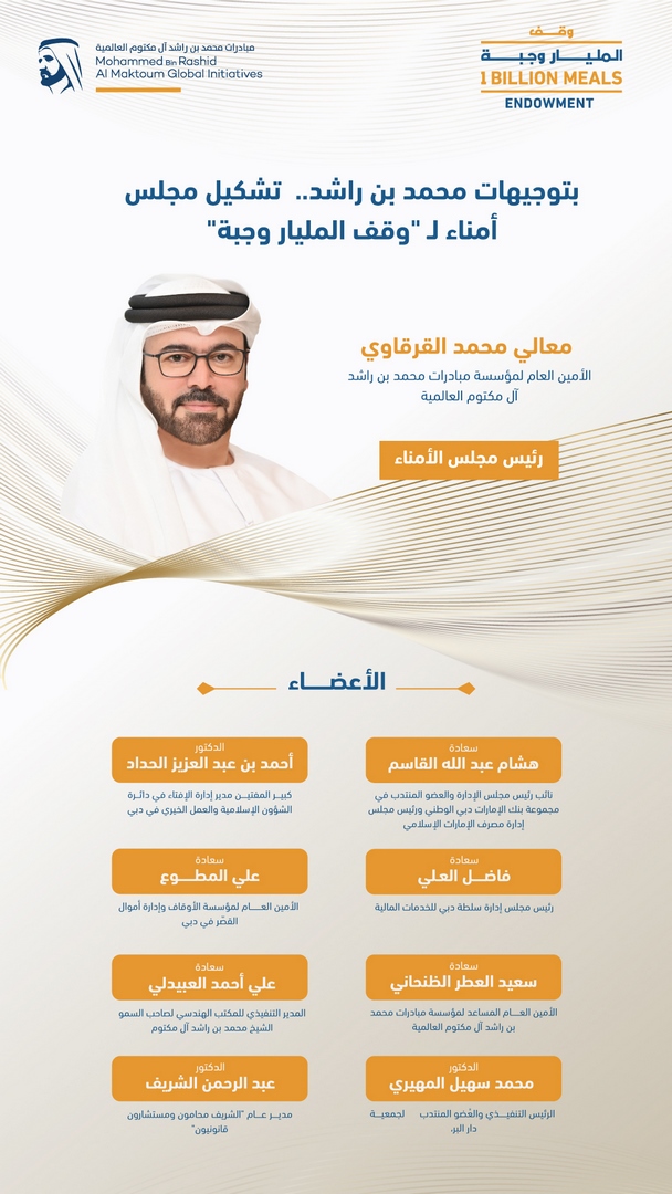 وجه صاحب السمو الشيخ محمد بن راشد آل مكتوم نائب رئيس الدولة رئيس مجلس الوزراء حاكم دبي “رعاه الله”، بتشكيل مجلس أمناء لـمبادرة “وقف المليار وجبة” التي تنضوي تحت مظلة مؤسسة مبادرات محمد بن راشد آل مكتوم العالمية، وذلك بهدف إدارة وضمان إنماء أصول أكبر مشروع وقفي لإطعام الطعام، واستدامة الخير والعطاء وتحقيق أعلى عوائد دورية على أصوله.