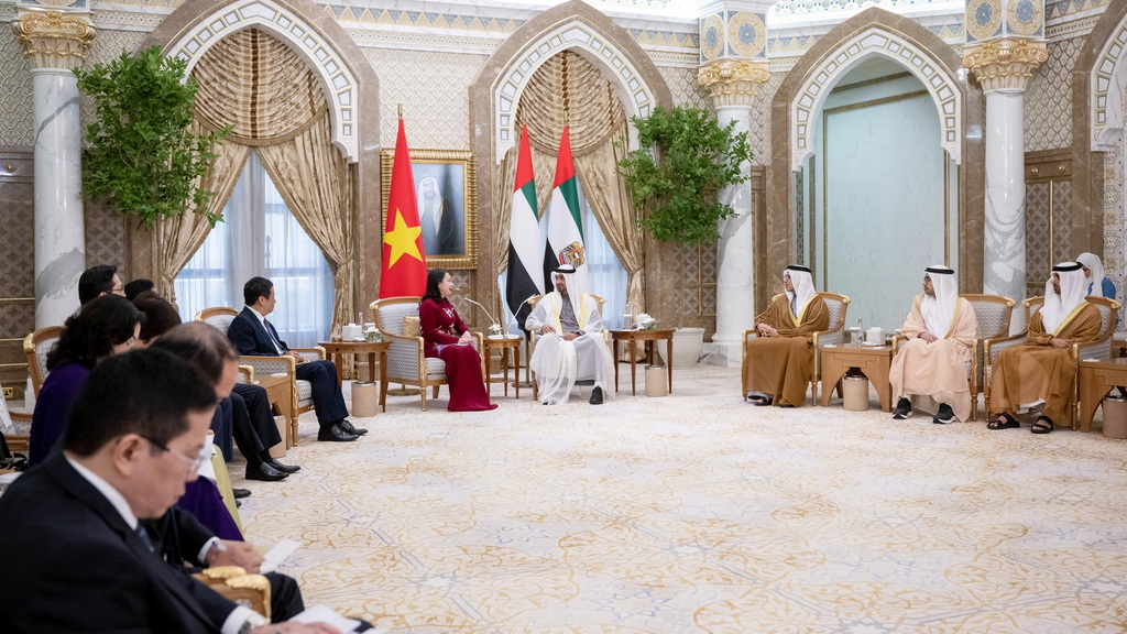 واستعرض سموه ومعالي نائبة الرئيس مختلف جوانب التعاون بين دولة الإمارات وفيتنام وإمكانيات تنويعها وتنميتها خاصة في المجالات الاستثمارية المشتركة والاقتصادية والتنموية والطاقة المتجددة والأمن الغذائي وغيرها من الجوانب التي تتسق مع جهودهما في تحقيق التنمية المستدامة.