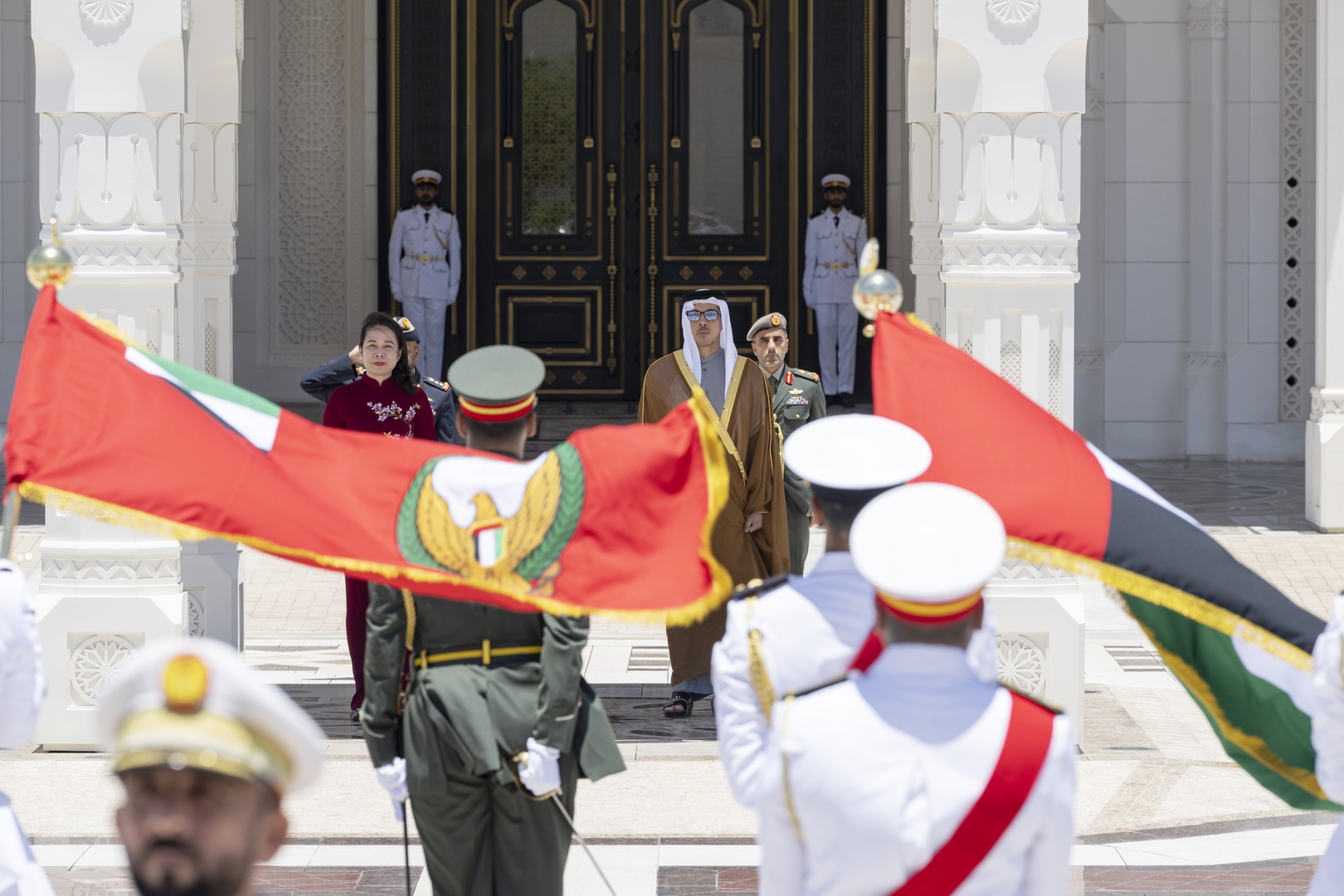 وكانت نائبة الرئيس الفيتنامي قد وصلت الدولة في وقت سابق اليوم حيث كان في استقبالها لدى وصولها قصر الوطن .. سمو الشيخ منصور بن زايد آل نهيان نائب رئيس الدولة نائب رئيس مجلس الوزراء وزير ديوان الرئاسة..وجرت لها مراسم استقبال رسمية حيث اصطحب سمو الشيخ منصور بن زايد آل نهيان الضيفة إلى منصة الشرف وعزم السلام الوطني لفيتنام ثم السلام على الجانبين، فيما أطلقت المدفعية 21 طلقة تحية لضيفة البلاد.
