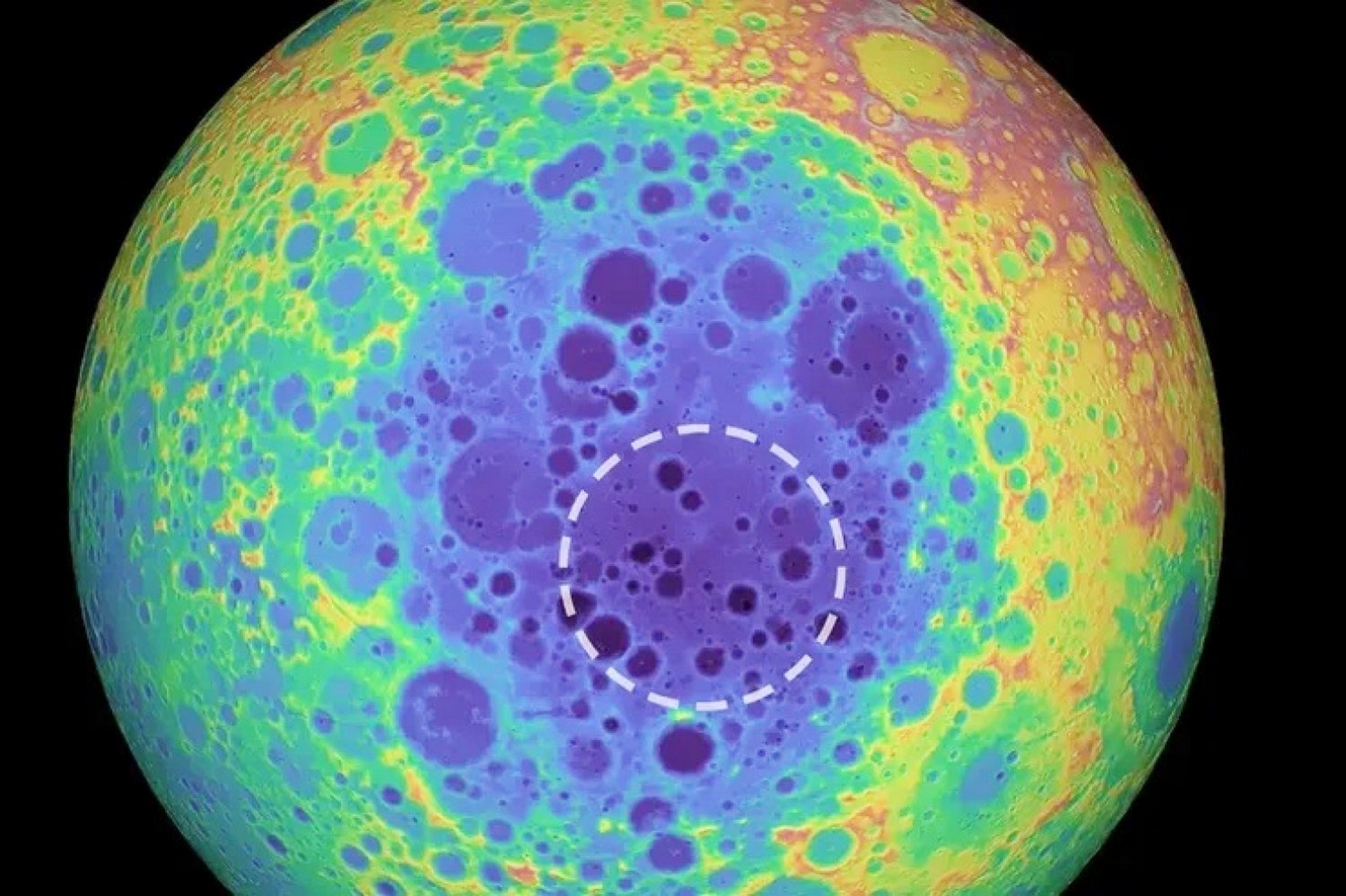 أسفل حوض أيتكين بالقطب الجنوبي في القمر – إحدى أضخم الحفر المحفوظة على مستوى النظام الشمسي – يوجد هيكل تقدر زنته بـ2.18 ميار كيلوغرام على الأقل، ويقدر عمقه بما يزيد على 300 كيلومتر (186 ميلاً)، بينما يبلغ طوله 2.000 كيلومتر (1.243 ميل).