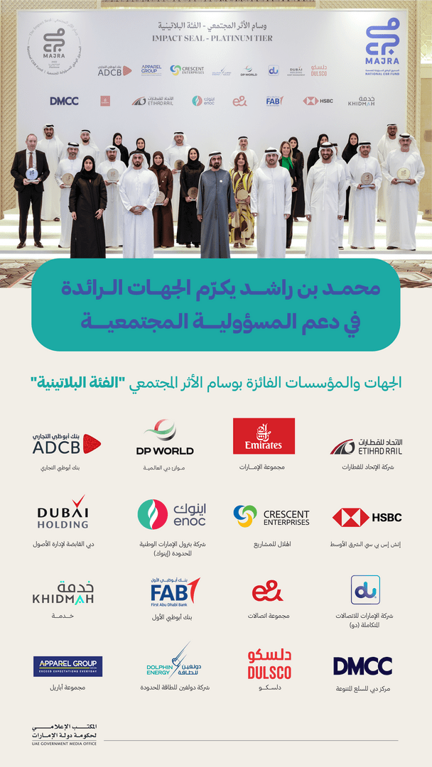 يأتي التكريم في إطار سعي حكومة دولة الإمارات إلى إحداث تحول في مفهوم المسؤولية المجتمعية من خلال الانتقال من المساهمات في الأنشطة الخيرية إلى توحيد الجهود لإطلاق مبادرات تنموية تتبنى المعايير البيئية والاجتماعية والحوكمة المؤسسية وأهداف التنمية المستدامة، سعياً لدعم اقتصاد الدولة بشكل إيجابي ومستدام.