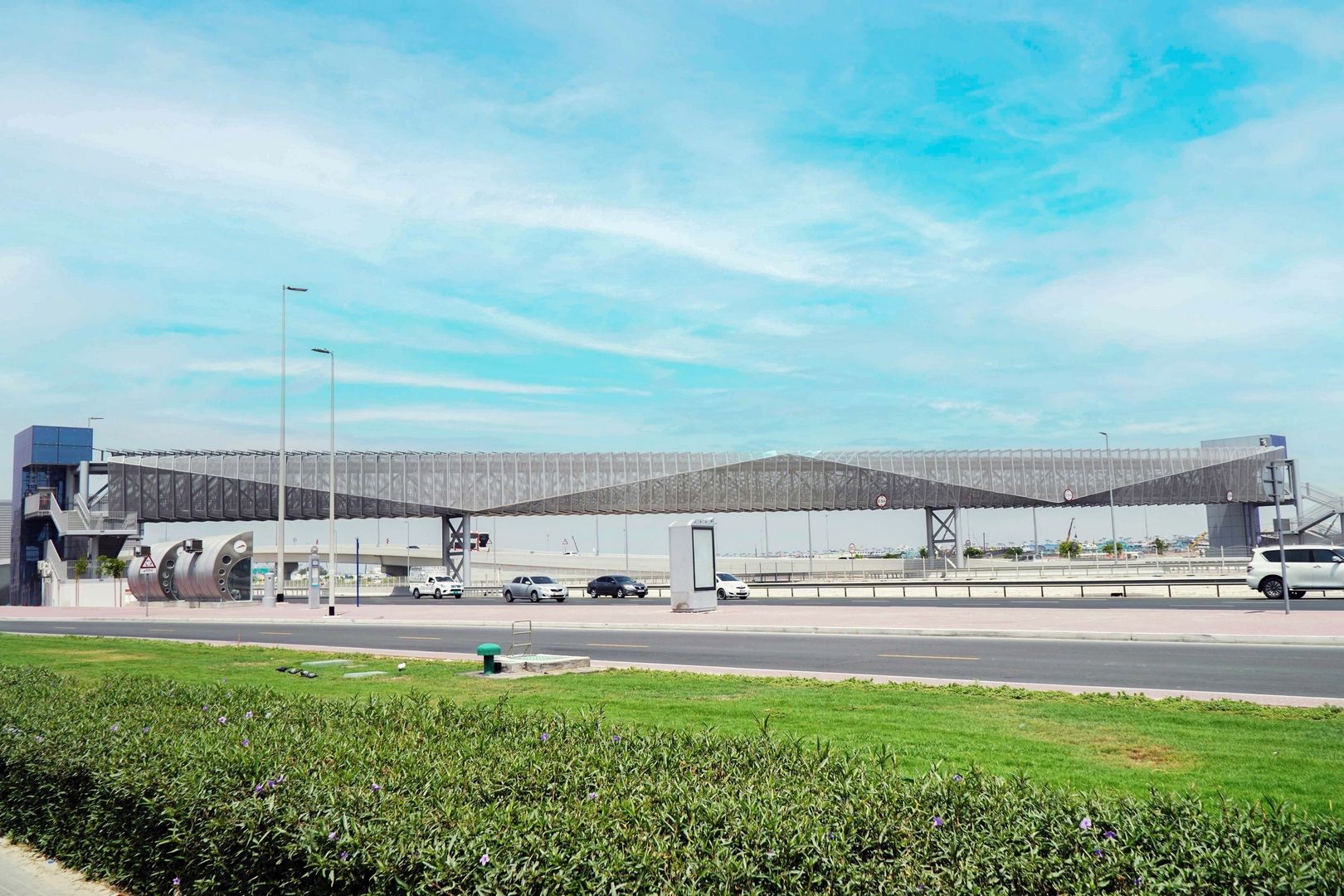 وأضاف: يجري حالياً تنفيذ ستة جسور للمشاة على عدد من الشوارع الحيوية في الإمارة، وذلك على النحو التالي: جسر على شارع الميناء بين تقطعي الصقر والميناء، بطول 109 أمتار، وعرض 3.4 متر، وارتفاع 6.5 متر من الإسفلت وجسر آخر على شارع الشيخ راشد بن سعيد، بين شارع الشيخ خليفة بن زايد وشارع الشيخ صباح الأحمد الجابر الصباح، بطول 91 متراً، وعرض 3.4 متر، وارتفاع 6.5 متر من الإسفلت، ويشتمل الجسرين على مصاعد كهربائية وسلالم، وغرفة للأنظمة الكهروميكانيكية، تحتوي على أنظمة إنذار ومكافحة الحريق وأنظمة للمراقبة عن بعد.