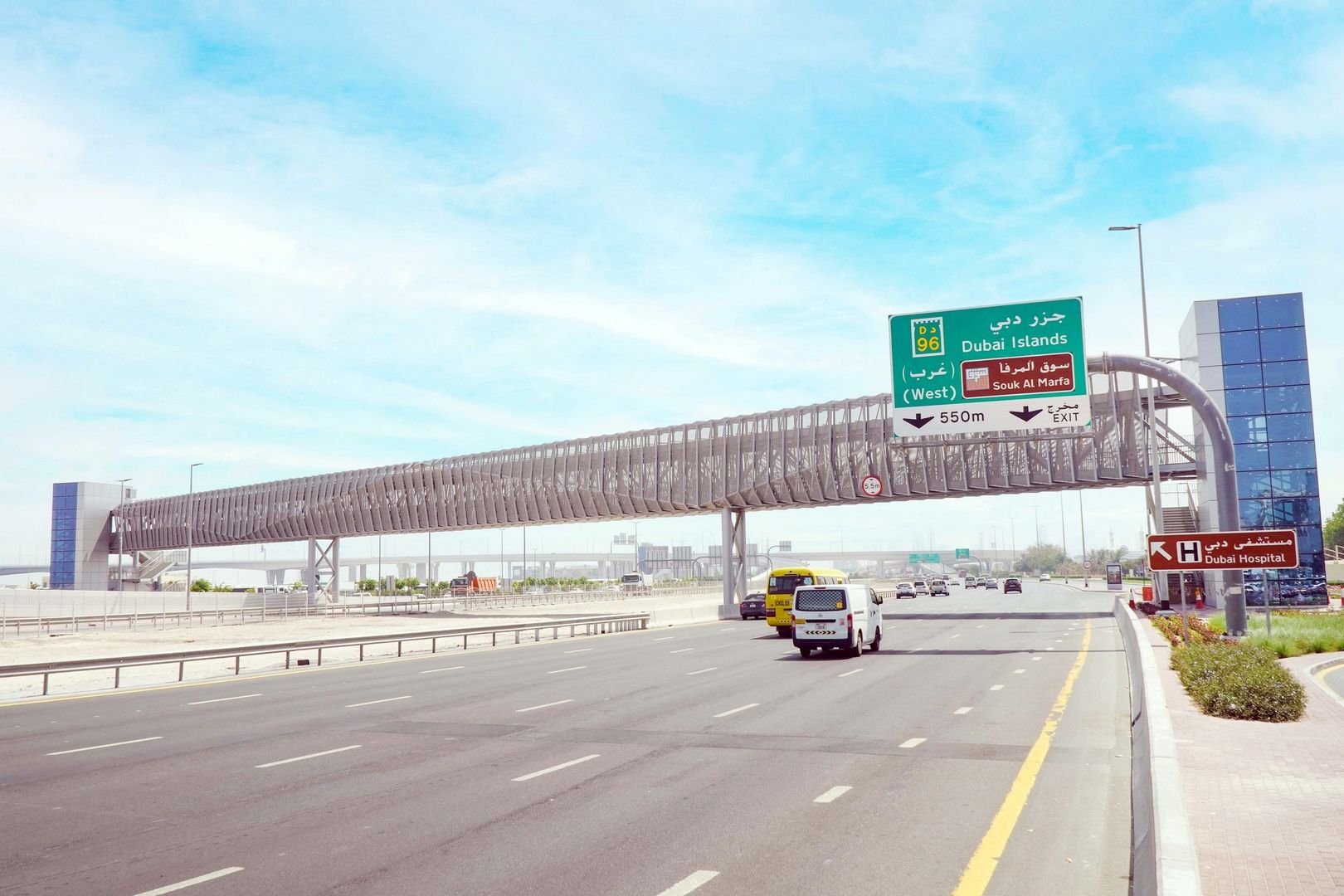 وسيجري تنفيذ الجسر الخامس على شارع المنارة في منطقة القوز الإبداعية، وروعي في تصميمة إضافة لمسات جمالية، تنسجم مع الهوية التصميمية والطابع الجمالي لمرافق ومكونات المنطقة، ويبلغ طول الجسر بطول 45 متراً، وعرض 5.5 متر، وارتفاع 6 أمتار من الاسفلت، ويتضمن تنفيذ طريقين منحدرين على جانبي الجسر، بطول 210 أمتار لكل منحدر، أما الجسر السادس، فسيتم تنفيذه على شارع الخوانيج، مقابل أرابيان سنتر بطول 248 متراً، وعرض 5.6 متر، وارتفاع 6 أمتار من الاسفلت، ويشتمل على مصعدين كهربائيين، وطريقين منحدرين، بطول 128.5 متر لكل منحدر، وعرض 5.6 متر، وسيجري ربطة مع مسار الدراجات الهوائية في المنطقة.