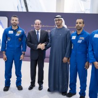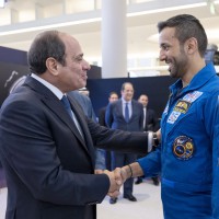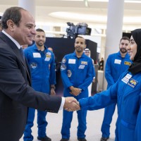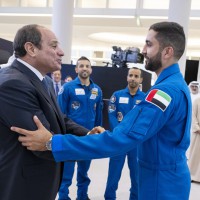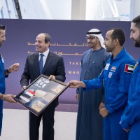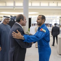 وكان فخامة الرئيس عبد الفتاح السيسي قد وصل في وقت سابق اليوم إلى الدولة حيث كان صاحب السمو رئيس الدولة في مقدمة مستقبلي فخامته في مطار أبوظبي، وقد رافق سموه الرئيس المصري للسلام على رواد الفضاء الإماراتيين على أرض المطار ـ الذي أقيم فيه حفل استقبال رسمي وشعبي بمناسبة عودة رائد الفضاء سلطان النيادي إلى أرض الوطن ــ وهنأ الرئيس السيسي فريق العمل بالإنجاز الذي حققه سلطان النيادي مؤكداً أن هذا الإنجاز مصدر فخر لكل عربي متمنياً لدولة الإمارات مزيداً من التقدم في مختلف المجالات.