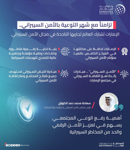 تشارك دولة الإمارات العالم تجاربها الرائدة والناجحة في مجال الأمن السيبراني تزامناً مع الجهود الدولية للاحتفاء بشهر التوعية بالأمن السيبراني في أكتوبر من كل عام والذي يشكل ركيزة أساسية في حماية الفضاء الرقمي والأفراد والمؤسسات من الجرائم الإلكترونية وعمليات الاحتيال عبر الإنترنت.