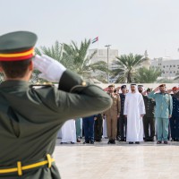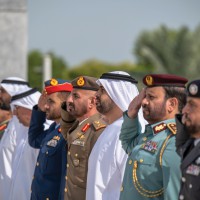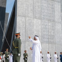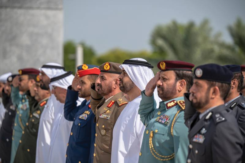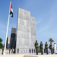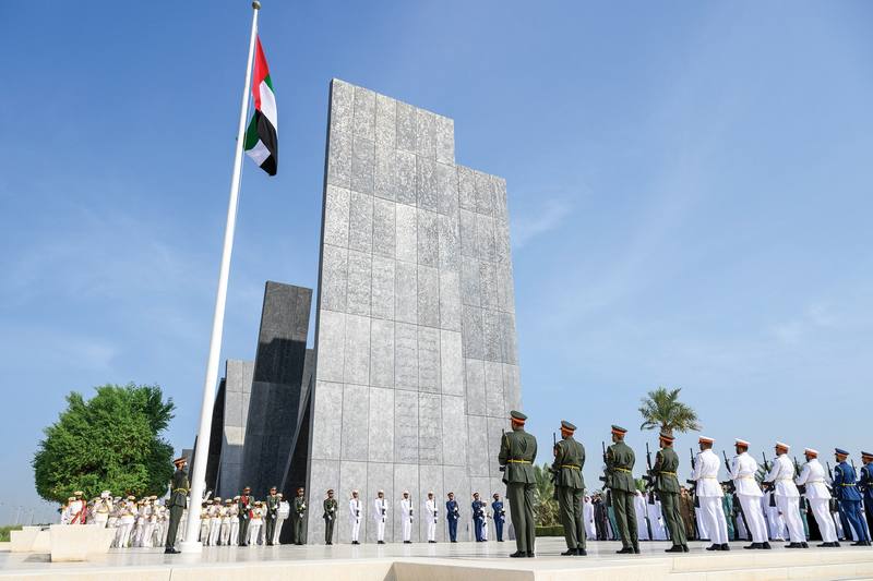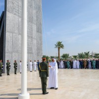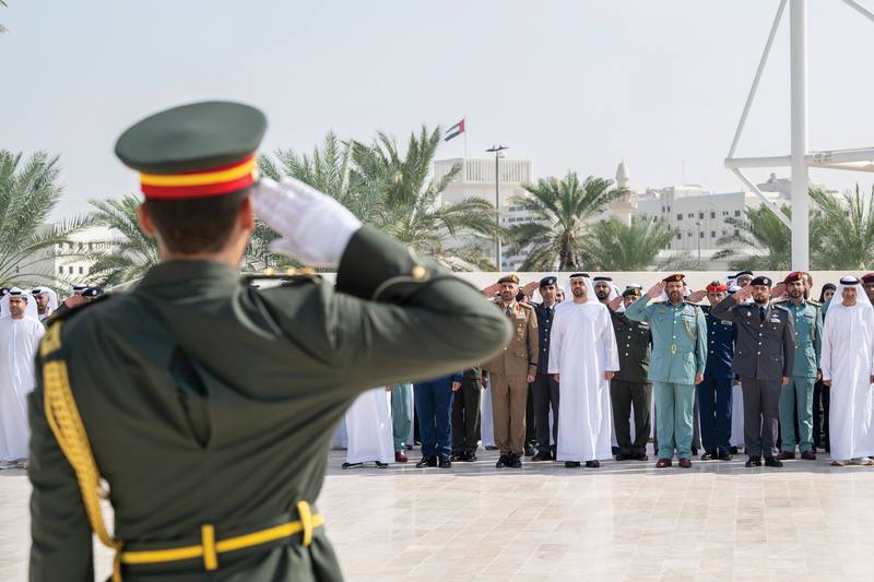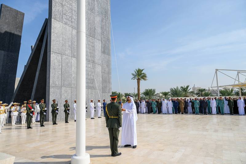 رفع سموّ الشيخ ذياب بن محمد بن زايد آل نهيان، رئيس مكتب الشؤون التنموية وأسر الشهداء في ديوان الرئاسة، علم دولة الإمارات العربية المتحدة في واحة الكرامة، في أبوظبي احتفالاً بمناسبة «يوم العلم».