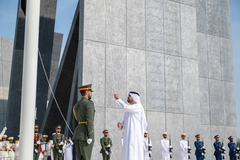 ورفع سموه العلم في تمام الساعة العاشرة صباحاً، من يوم الجمعة 3 نوفمبر، 2023، خلال مراسم الاحتفال التي نظَّمه مكتب الشؤون التنموية وأسر الشهداء في ديوان الرئاسة، وحضره ممثّلو وزارة الدفاع ووزارة الداخلية ووزارة الخارجية والقيادة العامة لشرطة أبوظبي والهلال الأحمر الإماراتي.