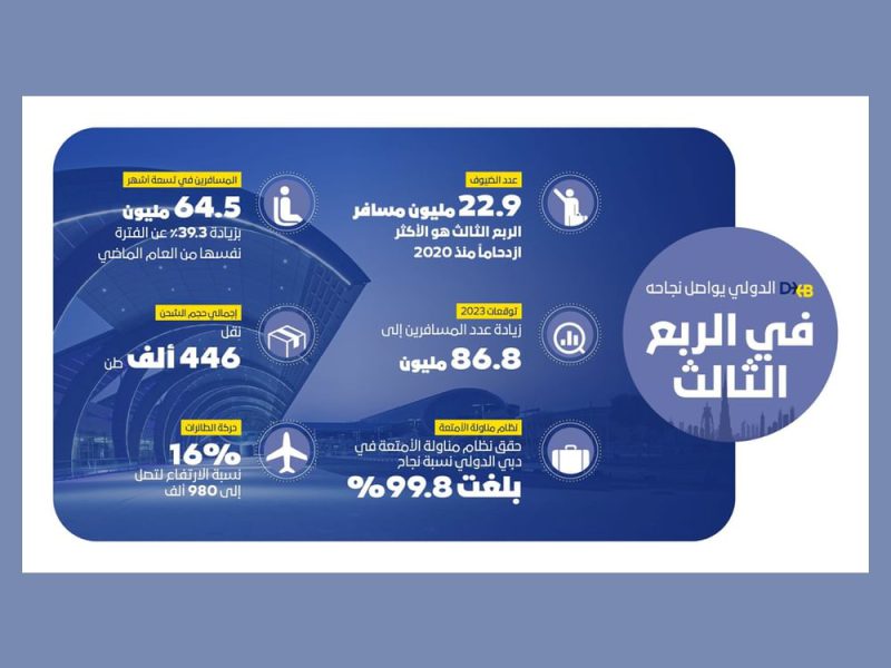 يُذكر أن عدد الأمتعة التي تم التعامل معها في مطار دبي الدولي خلال التسعة أشهر الأولى في عام 2023 شكلت نسبة 106.07% مقارنة بحجم الأمتعة لعام 2019.