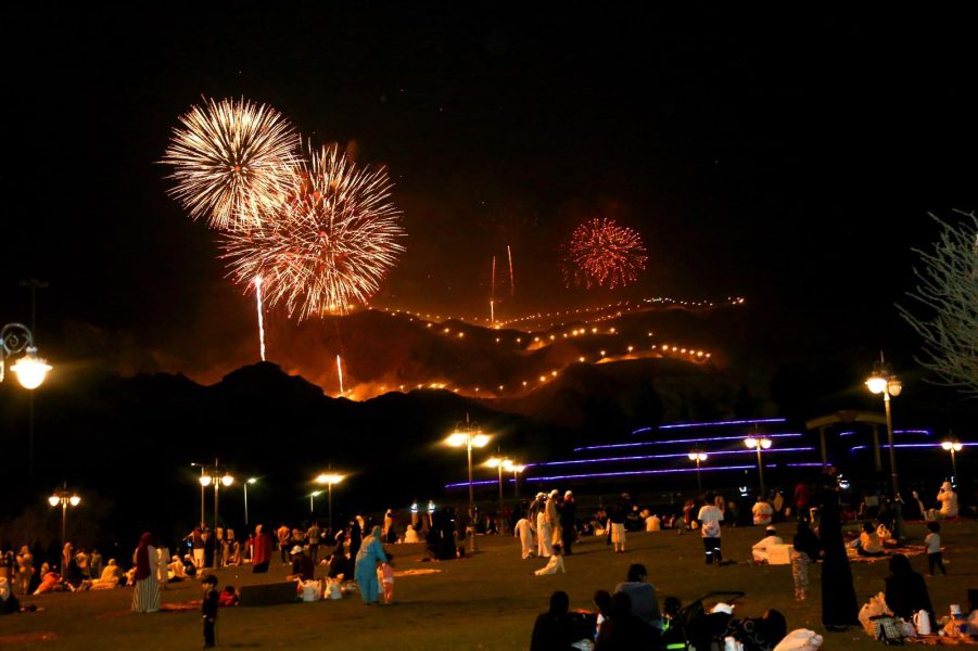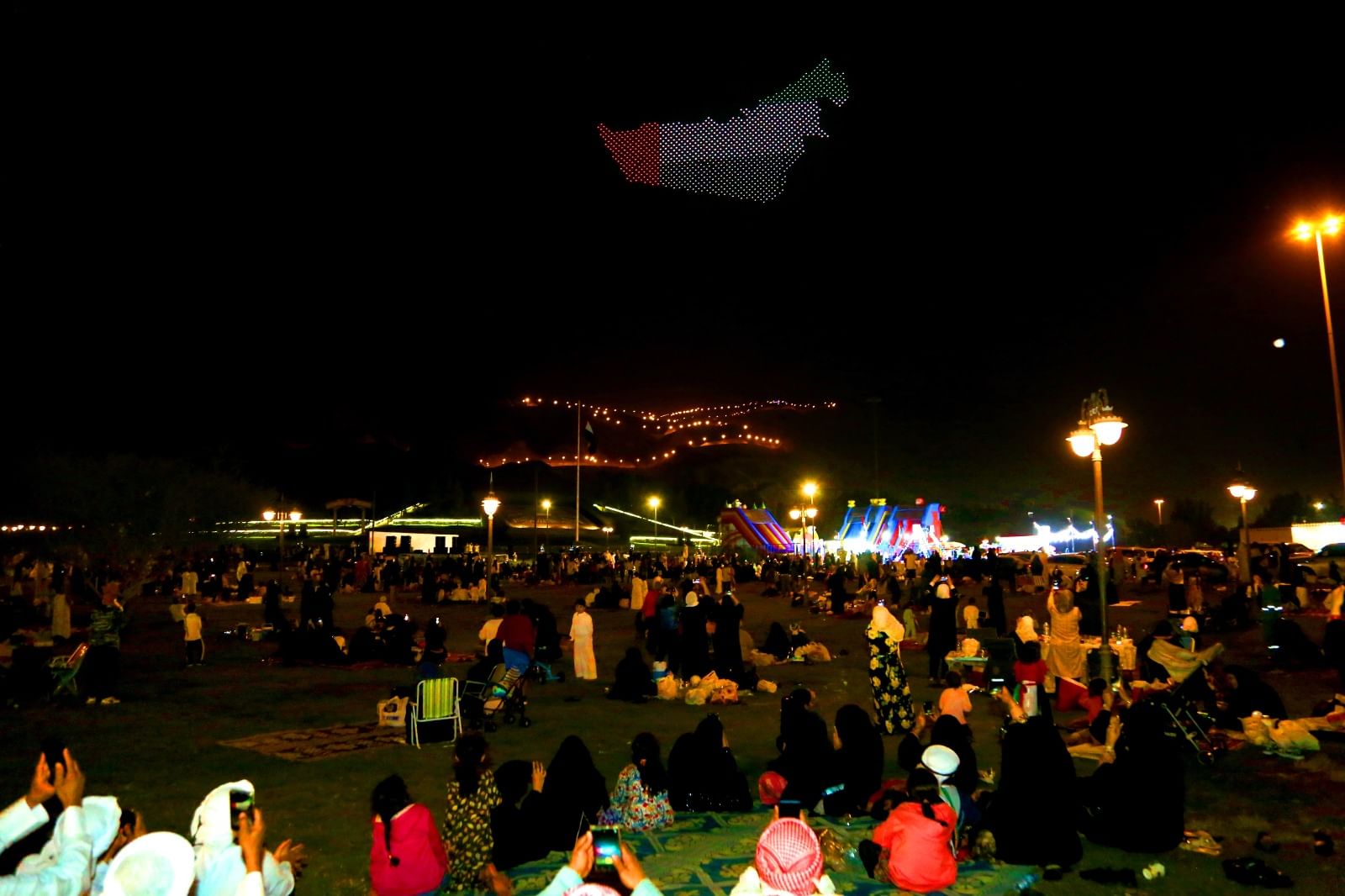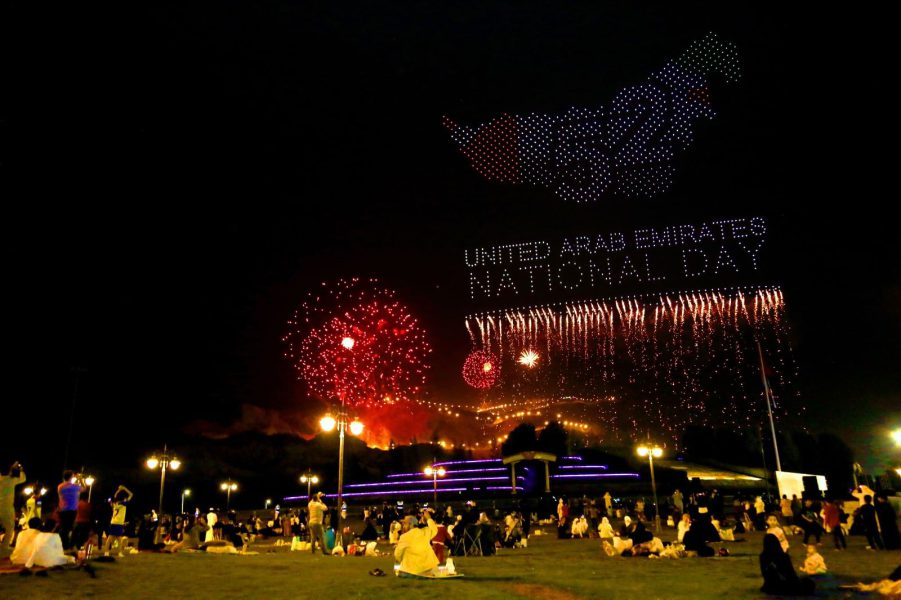 وشهد جبل حفيت عروضاً مبهره للألعاب النارية وطائرات الدرون من خلال استعراضات مميزة تحاكي مسيرة التطور والتقدم لدولة الإمارات في مجال الفضاء والابتكار والتقدم في مختلف المجالات عبر تصورات فنية لمشهد مستقبلها المشرق، فيما شهدت واجهة مبنى بلدية مدينة العين الأيقوني عروضا ضوئية مميزة رسمت لوحات مميزة تحتفي بإنجازات دولة الإتحاد.