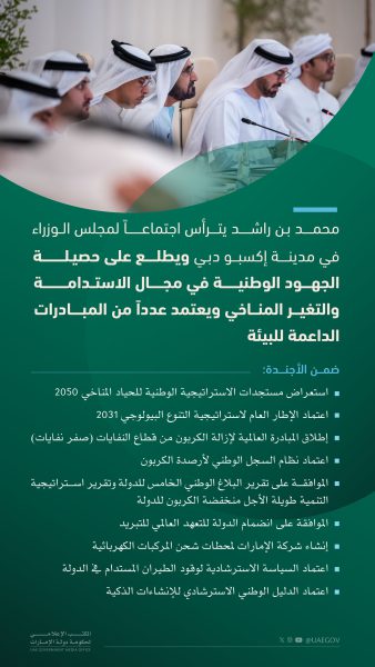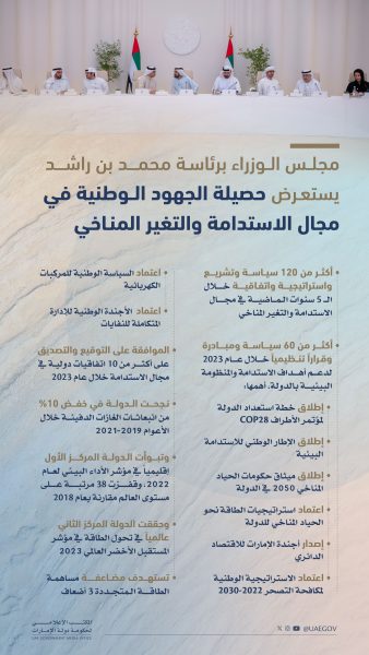 وقال صاحب السمو الشيخ محمد بن راشد آل مكتوم: “ترأست في “مدينة إكسبو دبي” اجتماعاً لمجلس الوزراء تزامناً مع انعقاد مؤتمر COP28، استعرضنا في بدايته حصيلة الجهود الوطنية للدولة في المجال البيئي التي شملت أكثر من 120 قراراً في الاستدامة والتغير المناخي وتنمية مواردنا الطبيعية أصدرها المجلس خلال الأعوام الخمسة الماضية… وفي العام 2023 وحده، أطلقنا أكثر من 60 قراراً جديداً شكلت منظومة متكاملة من السياسات والتشريعات والاستراتيجيات والمبادرات لتعزيز جهود الدولة وملفها في مشاركة العالم التصدي لآثار التغير المناخي”.