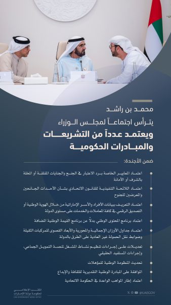وفي الشؤون الحكومية، اعتمد مجلس الوزراء إطار المواهب الواعدة في الحكومة الاتحادية بهدف تعزيز آليات استكشاف المواهب الواعدة في الجهات الاتحادية للدولة، وتمكين المواهب الواعدة من المساهمة في تطوير العمل الحكومي للدولة، وتعزيز فرص مساهماتهم في المشاريع والمبادرات الحكومية، بالإضافة إلى تأسيس قاعدة بيانات للمواهب الواعدة في الحكومة الاتحادية، وإيجاد مرجعية للحكومة للاستفادة من خبرات ومهارات الشباب في مختلف القطاعات.