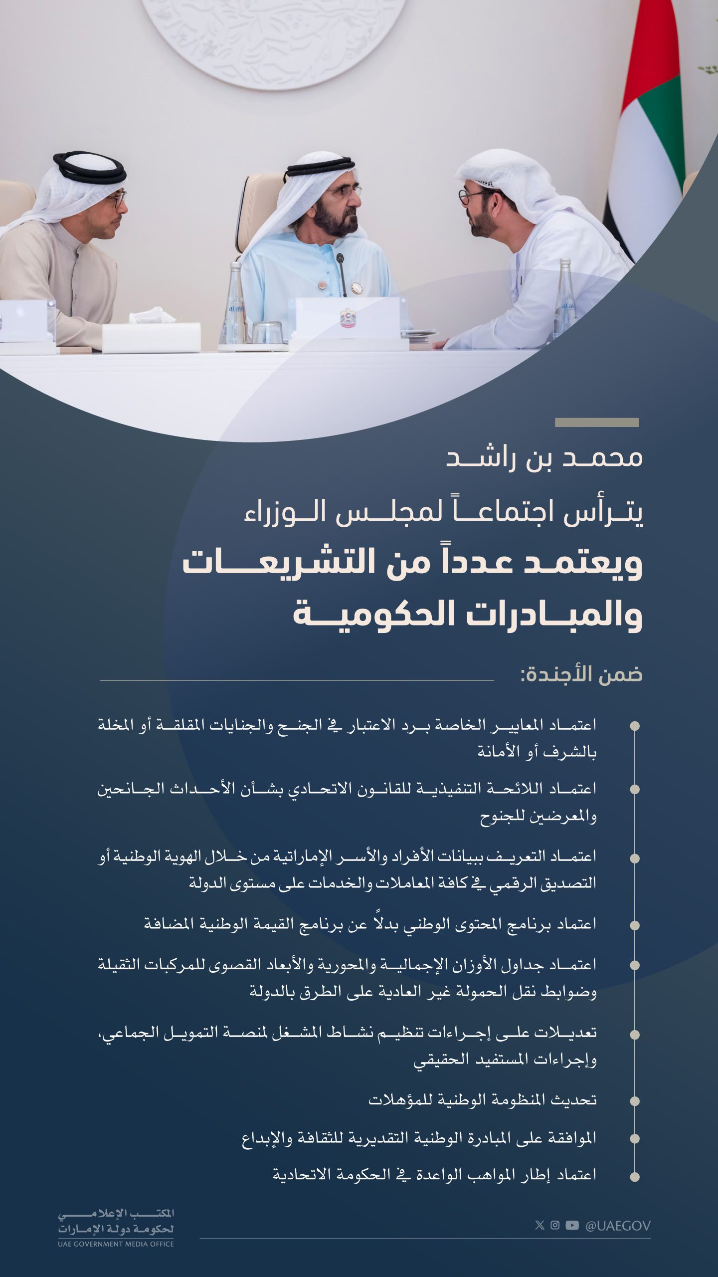 كما اعتمد المجلس عدداً من التشريعات الهادفة لتطوير وتعزيز تنافسية القطاعات الاستراتيجية على مستوى الدولة، شملت تحديث قرار مجلس الوزراء بشأن تنظيم نشاط المشغل لمنصة التمويل الجماعي وذلك لمعالجة التحديات التي يواجهها هذا القطاع على مستوى الدولة، ودعم الشركات العاملة وتشجيع الاستثمارات العالمية الواردة للدولة على مستوى هذا القطاع، بالإضافة إلى إصدار قرار مجلس الوزراء بشأن تحديد جداول الأوزان الإجمالية والمحورية والأبعاد القصوى للمركبات الثقيلة وضوابط نقل الحمولة غير العادية على الطرق بالدولة.