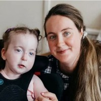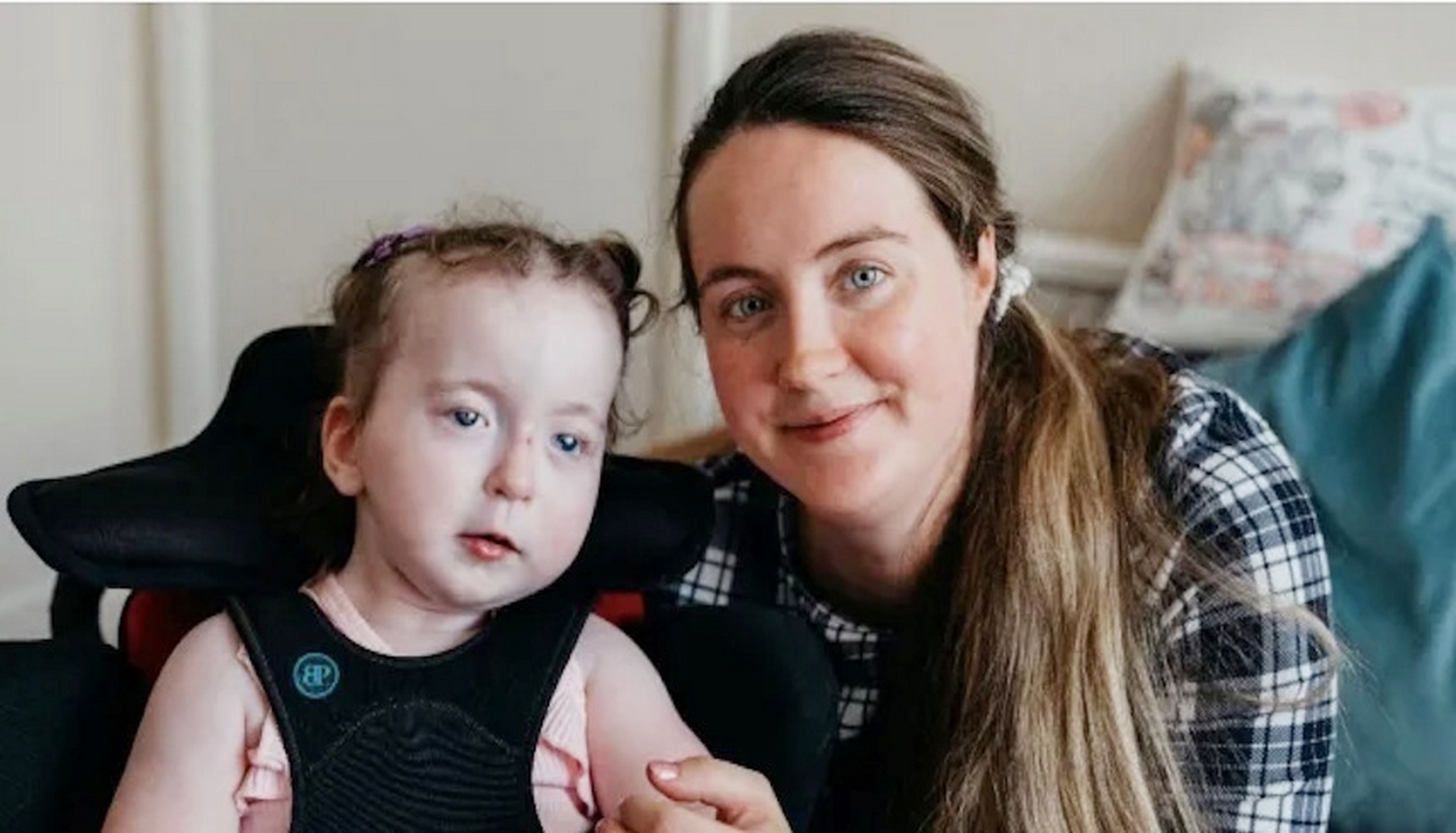 وتصف الأم “سيان” ابنتها بأنها طفلة سعيدة ومفعمة بالحيوية، لكنها تقول إنها متأخرة في النمو بالنسبة لعمرها، ولا تستطيع الجلوس دون مساعدة، وغير قادرة على الوقوف أو المشي، الأمر الذي استوجب تزويدها بمعدات متخصصة، مثل إطار الوقوف، وكرسي خاص، وعربة لمساعدتها في الحركة اليومية.