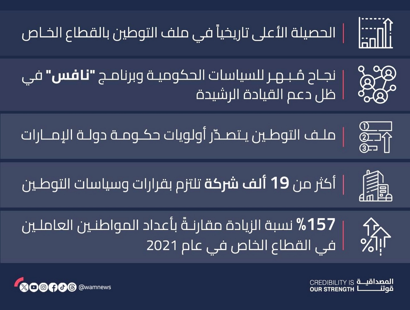 وتطبق الإمارات سياسة شاملة تتضمن التحفيز والتدريب والتأهيل للمواطنين في العديد من المجالات، سعياً للارتقاء بمهاراتهم وضمان حصولهم على الوظائف التي يطمحون إليها في القطاع الخاص كركيزة رئيسة لحياة كريمة، وتعزيز مساهمتهم في قيادة ركب التطور والتنمية الاقتصادية في الدولة.
