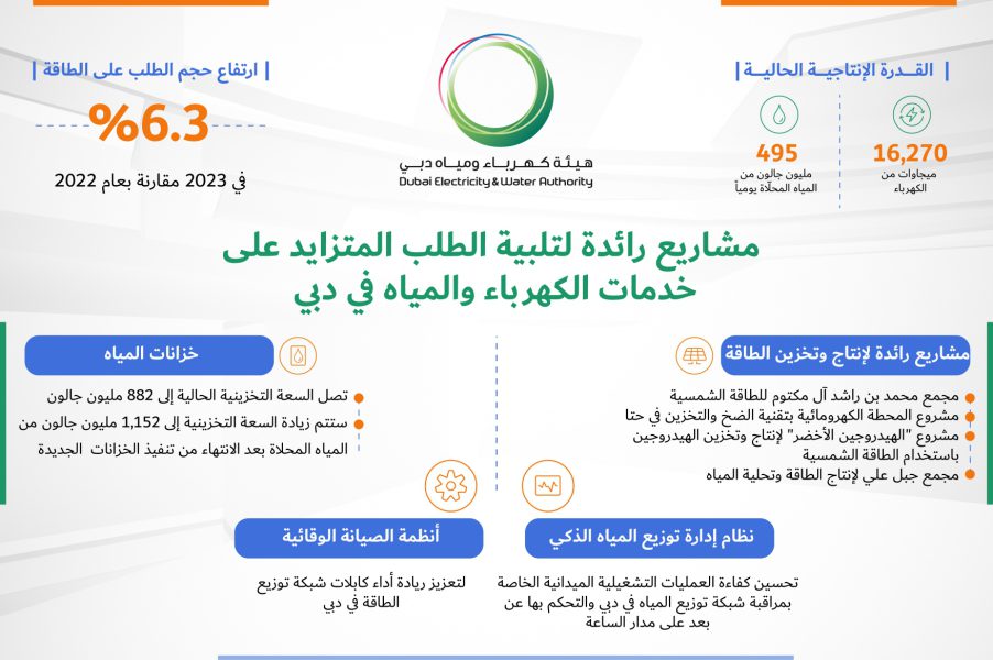 توفر هيئة كهرباء ومياه دبي إمدادات آمنة وموثوقة للطاقة والمياه لضمان ظروف مريحة لجميع سكان الإمارة على مدار الساعة وذلك ضمن نطاق التزامها بتحديد الأولويات وتلبية احتياجات إمارة دبي من الطاقة والمياه وانسجاماً مع حرصها على دعم الهدف السادس من أهداف التنمية المستدامة الـ17 التي اعتمدتها الأمم المتحدة لعام 2030 والذي ينص على “ضمان توافر المياه وخدمات الصرف الصحي للجميع” وذلك من خلال بنية تحتية متطورة تعمل على مواكبة ارتفاع حجم الطلب على الطاقة في إمارة دبي والذي يقدر خلال عام 2023 بنسبة 6.3% مقارنة بعام 2022 ، من خلال مشاريع وبرامج رائدة ، وقد وصلت القدرة الإنتاجية الحالية لهيئة كهرباء ومياه دبي إلى 16,270 ميجاوات من الكهرباء و495 مليون جالون من المياه المحلّاة يومياً.