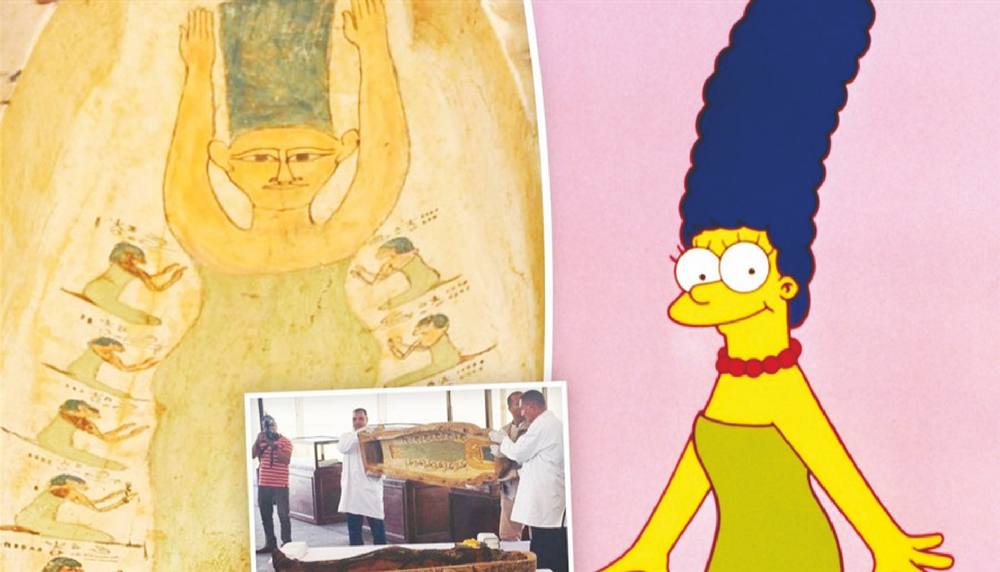 لكن المفاجأة كانت في احتواء الغطاء العلوي لأحد التوابيت على نقش لامرأة صفراء اللون، ترتدي ملابس خضراء وتاجاً أزرق، وهو ما شبّهه العلماء “بالأم مارج ذات الشعر الأزرق الكبير” في مسلسل “عائلة سيمبسون”.