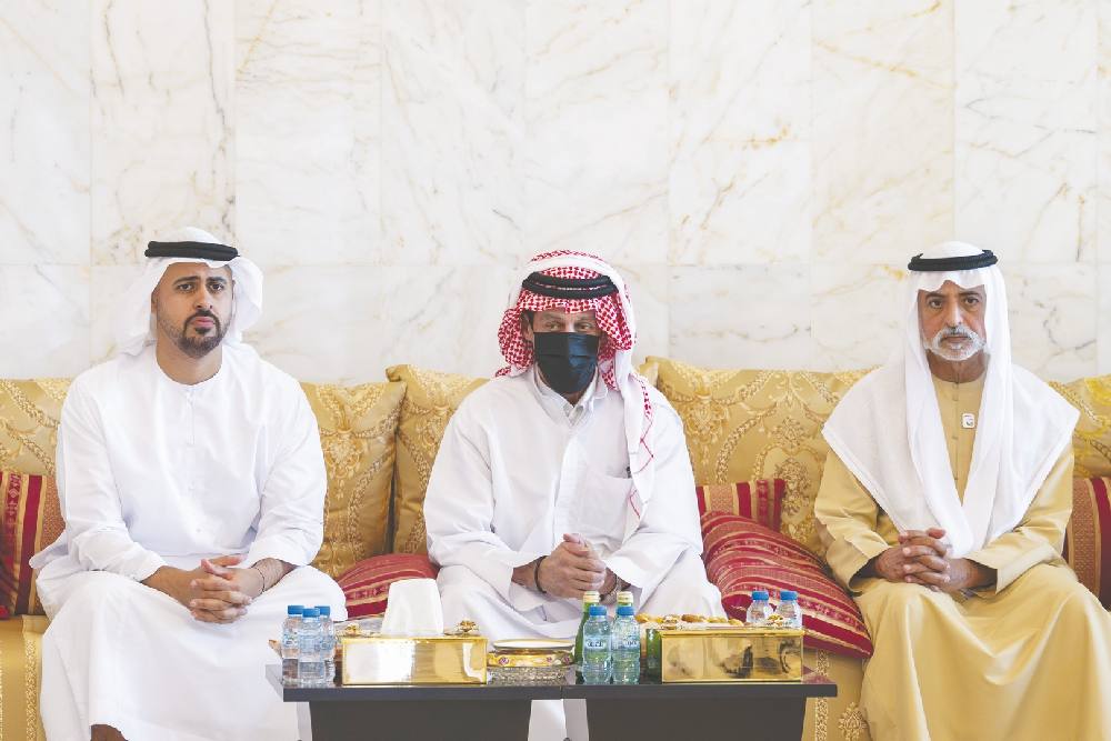 قدم سمو الشيخ ذياب بن محمد بن زايد آل نهيان نائب رئيس ديوان الرئاسة للشؤون التنموية وأسر الشهداء، ومعالي الشيخ نهيان بن مبارك آل نهيان وزير التسامح والتعايش، أمس الاثنين، واجب العزاء إلى الشيخ خليفة بن سلطان بن شخبوط آل نهيان في وفاة والدته المغفور لها الشيخة ميرة بنت راشد بن حفيظ المزروعي، أرملة الشيخ سلطان بن شخبوط آل نهيان.