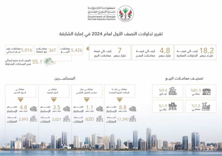 ارتفع حجم تداول القطاع العقاري في إمارة الشارقة خلال النصف الأول من العام 2024 بنسبة 35.6% مقارنة بنفس الفترة من عام 2023 مسجلا 18.2 مليار درهم ويعود ذلك للارتفاع المطرد في عدد معاملات البيع حيث بلغت 10,809 معاملة مقارنة بـ 6,592 معاملة لنفس الفترة من العام الماضي.