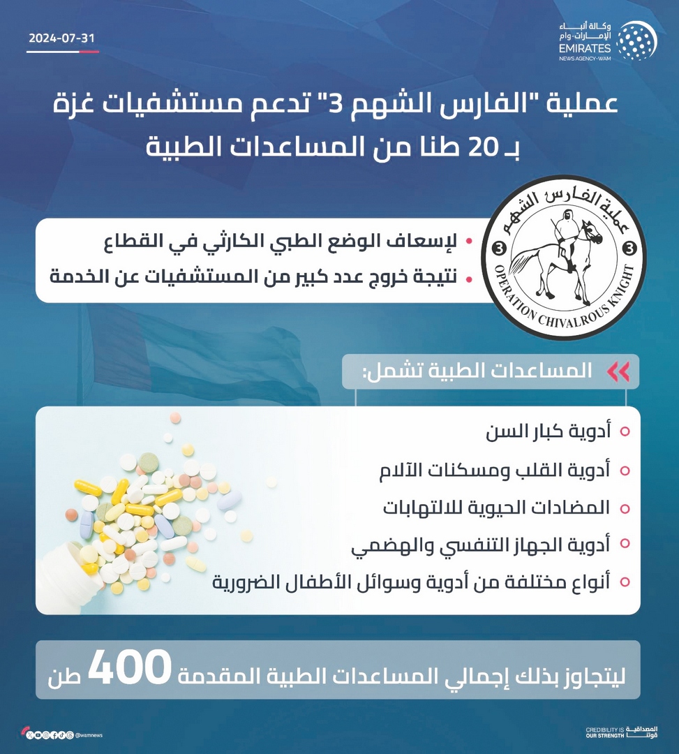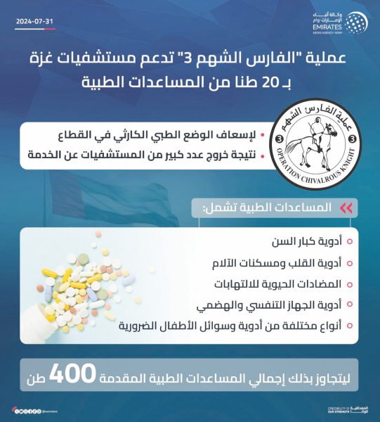 جدير بالذكر، أن عملية “الفارس الشهم 3” قدمت خلال الفترة الماضية المساعدات الطبية لكافة المستشفيات في قطاع غزة، من ضمنها شحنات الأدوية وسيارات الإسعاف، والأجهزة الطبية، وساهمت في توسيع المستشفيات لزيادة القدرة الاستيعابية، وزيادة الكفاءة وجودة الخدمات المقدمة للنازحين بعد توقف دخول الأدوية والمستلزمات الطبية نتيجة الأوضاع الصعبة في القطاع، ما يعكس نهج دولة الإمارات التي لطالما سارعت في الاستجابة لاحتياجات الشعب الفلسطيني، وكانت سباقة في خدمتهم وتقديم اللازم لهم. وام