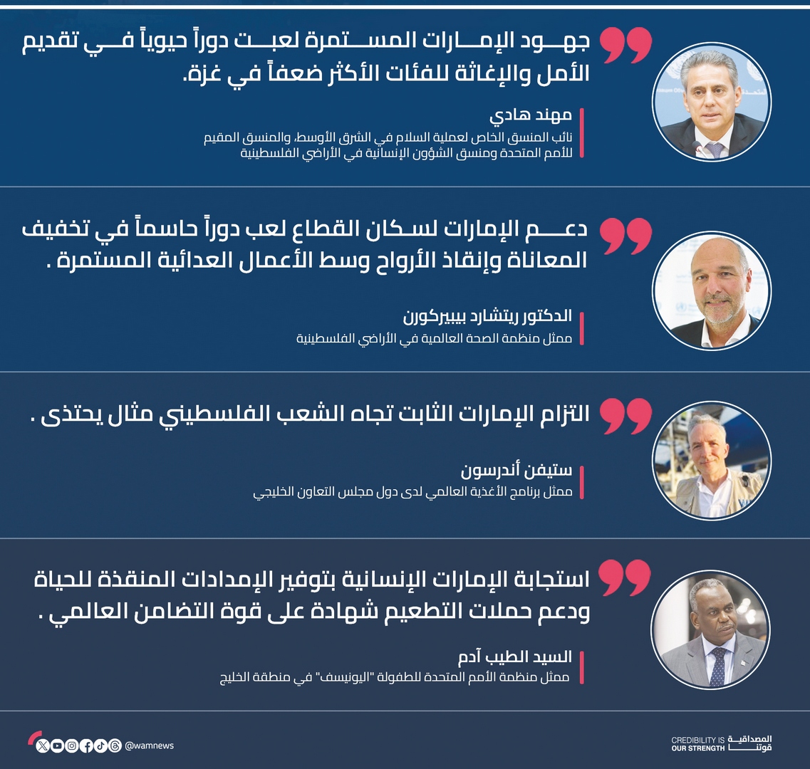 وقال مهند هادي، نائب المنسق الخاص لعملية السلام في الشرق الأوسط، والمنسق المقيم للأمم المتحدة ومنسق الشؤون الإنسانية في الأراضي الفلسطينية، إنه في ظل المعاناة الإنسانية الهائلة في قطاع غزة، أظهرت دولة الإمارات تضامنها والتزامها الثابت تجاه الشعب الفلسطيني، ويؤكد دعمها السخي خلال هذه الأوقات الصعبة تفانيها في تخفيف الأزمة الإنسانية وتقديم المساعدة الحاسمة لمن هم في أمس الحاجة إليها، وتؤدي جهود الإمارات المستمرة دورًا حيويًا في تقديم الأمل والإغاثة للفئات الأكثر ضعفًا، ونحن نشيد بقيادتها وتعاطفها في هذه الظروف الصعبة.