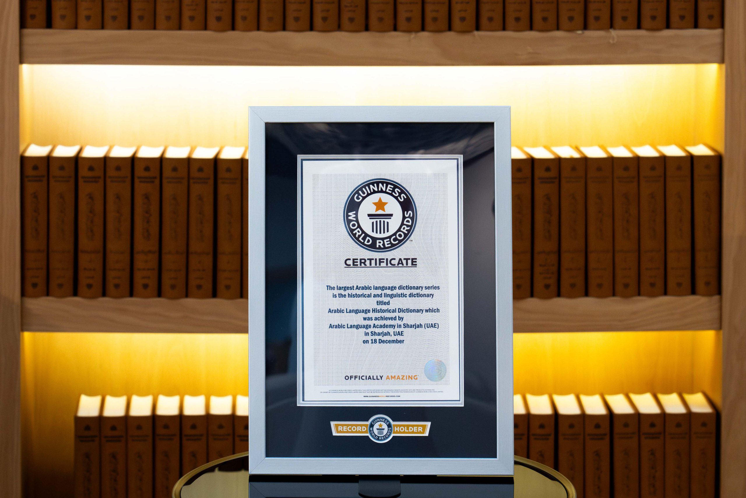 تسلّم صاحب السمو الشيخ الدكتور سلطان بن محمد القاسمي، عضو المجلس الأعلى حاكم الشارقة الرئيس الأعلى لمجمع اللغة العربية بالشارقة، صباح اليوم الأربعاء، شهادة من موسوعة غينيس للأرقام القياسية بمناسبة حصول المعجم التاريخي للغة العربية على لقب أكبر وأضخم مشروع لغوي تاريخي على مستوى العالم بعدد 127 مجلداً.