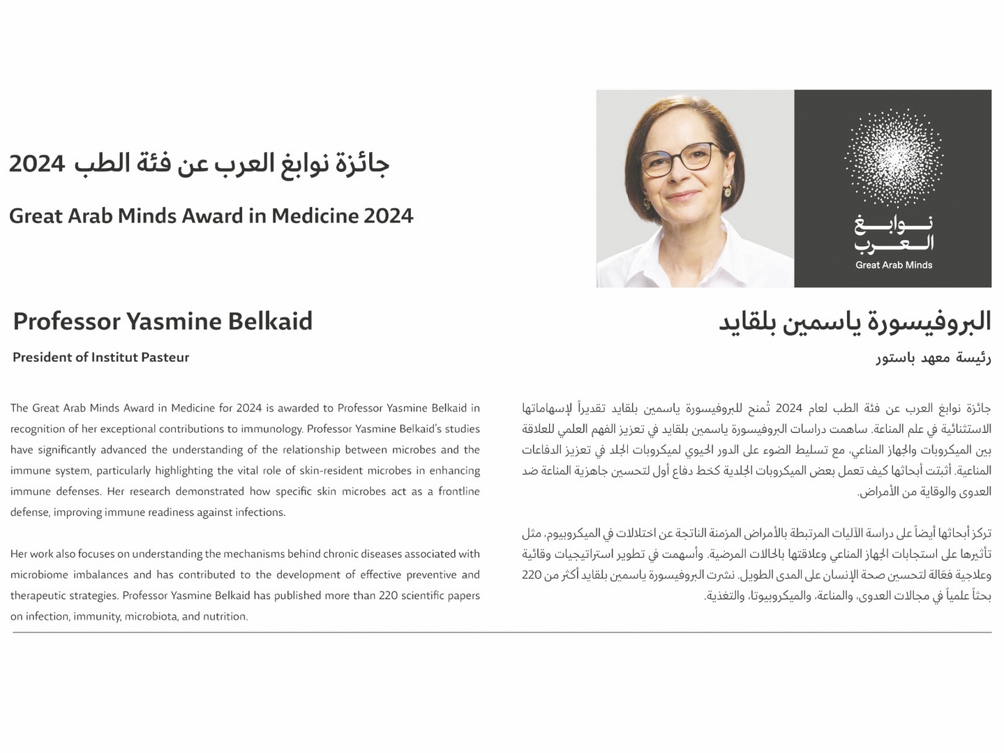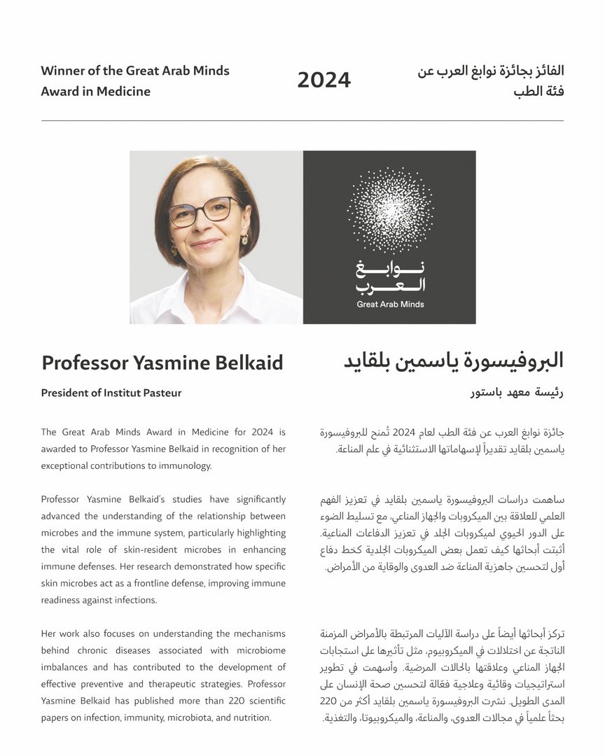 وقال صاحب السمو الشيخ محمد بن راشد آل مكتوم: “نبارك اليوم للفائزة بجائزة نوابغ العرب عن فئة الطب لعام 2024، البروفيسورة ياسمين بلقايد من الجزائر، رئيسة معهد باستور في فرنسا.. قدمت إسهامات استثنائية في علم المناعة، ودراسات مرتبطة بدور الميكروبات في تعزيز المناعة والوقاية من الأمراض.. نشرت البروفيسورة ياسمين بلقايد أكثر من 220 بحثاً علمياً في مجالات العدوى والمناعة”.
