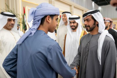 حضر حفل الاستقبال، الذي أُقيمَ اليوم في قاعة الخبيصي للأفراح في مدينة العين، عددٌ من كبار المسؤولين وأقارب العروسين وجمعٌ من المدعوِّين.