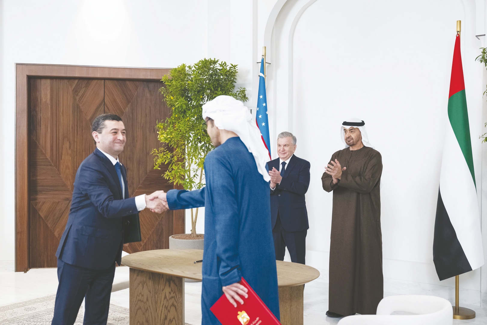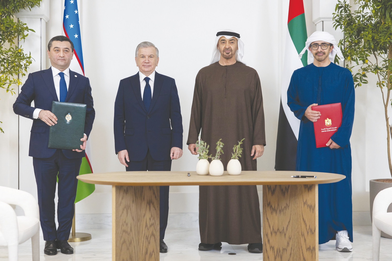 شهد صاحب السمو الشيخ محمد بن زايد آل نهيان رئيس الدولة “حفظه الله”، وفخامة شوكت ميرضيائيف رئيس جمهورية أوزبكستان، أمس، توقيع إعلان بشأن الشراكة الإستراتيجية بين البلدين.