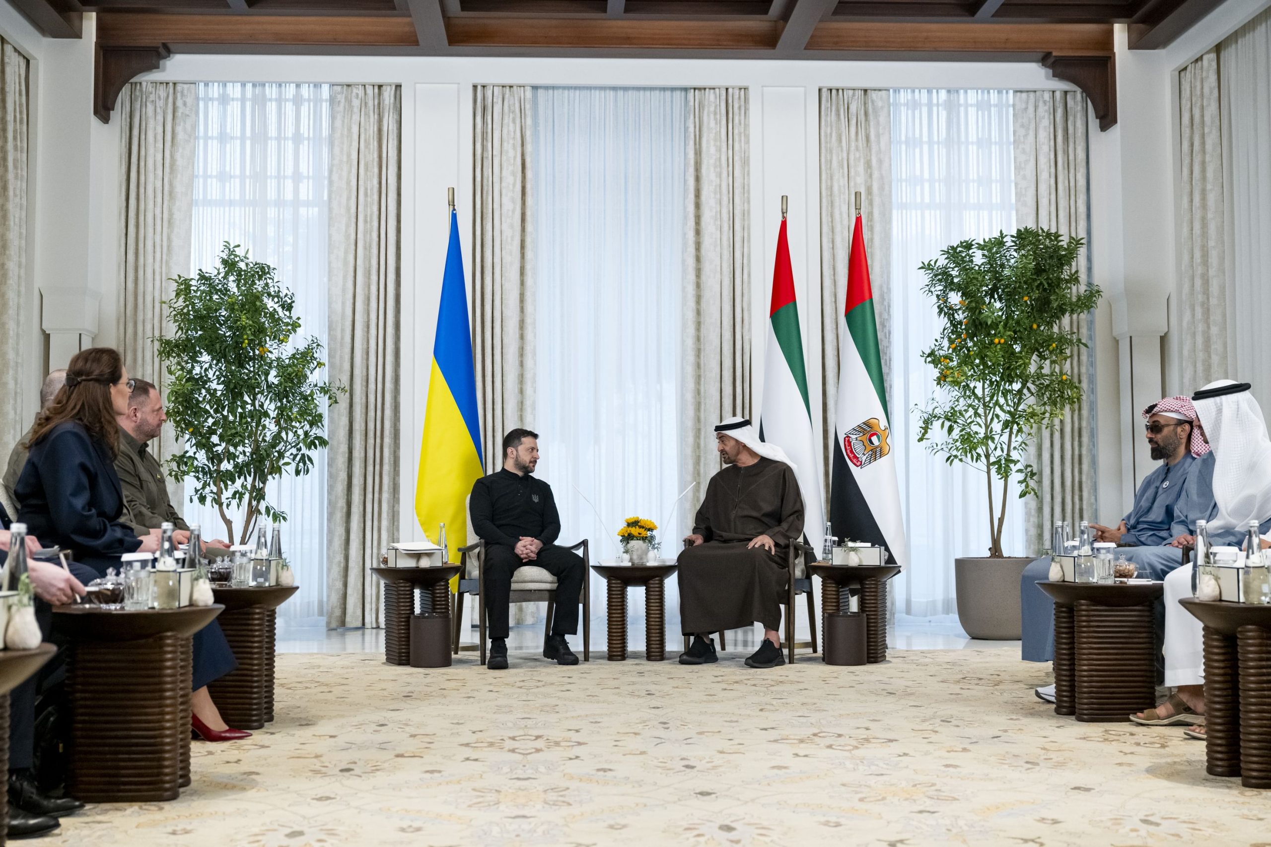 حضر اللقاء كل من..سمو الشيخ طحنون بن زايد آل نهيان نائب حاكم إمارة أبوظبي مستشار الأمني الوطني وسمو الشيخ عبد الله بن زايد آل نهيان نائب رئيس مجلس الوزراء وزير الخارجية وسمو الشيخ حمدان بن محمد بن زايد آل نهيان نائب رئيس ديوان الرئاسة للشؤون الخاصة ومعالي الشيخ محمد بن حمد بن طحنون آل نهيان مستشار رئيس الدولة ومعالي علي بن حماد الشامسي الأمين العام للمجلس الأعلى للأمن الوطني ومعالي الدكتورة آمنة بنت عبد الله الضحاك الشامسي وزيرة التغير المناخي والبيئة ومعالي محمد بن مبارك بن فاضل المزروعي وزير دولة لشؤون الدفاع ومعالي الدكتور ثاني بن أحمد الزيودي وزير دولة للتجارة الخارجية ومعالي فيصل عبد العزيز البناي مستشار رئيس الدولة لشؤون الأبحاث الإستراتيجية والتكنولوجيا المتقدمة وعدد من كبار المسؤولين والوفد المرافق للرئيس الأوكراني.