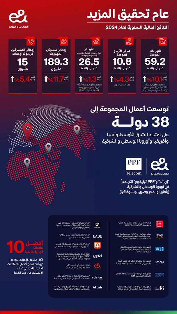 وتعليقًا على النتائج المالية، قال معالي جاسم محمد بوعتابه الزعابي، رئيس مجلس إدارة مجموعة “إي آند”: “لقد كان عام 2024عام النمو والريادة، مدفوعًا برؤية قوية مستندة إلى استراتيجية فعالة حرصْنا من خلالها على تعزيز الابتكار والالتزام المستمر والراسخ بالتمكين الرقمي. وقد تُوِّجَتْ هذه الجهود والنتائج بحصولنا على تصنيف “العلامة التجارية الأسرع نموًّا في العالم”، ومواصلة توسُّع ونموِّ علامتنا التجارية جغرافيًّا لتصل إلى أوروبا، وهو ما أضاف المزيد من الإنجازات الجديدة والمهمة في مسيرة نمو وتقدم “إي أند”. وقد انعكست هذه الإنجازات إيجابيًّا بتحقيق نتائج مالية قياسية لعام 2024؛ حيث وصلت الأرباح الصافية إلى 10.8مليار درهم، في حين نَمَتْ قاعدةُ المشتركين الإجمالية لتصل إلى 189.3 مليون مشترك”.