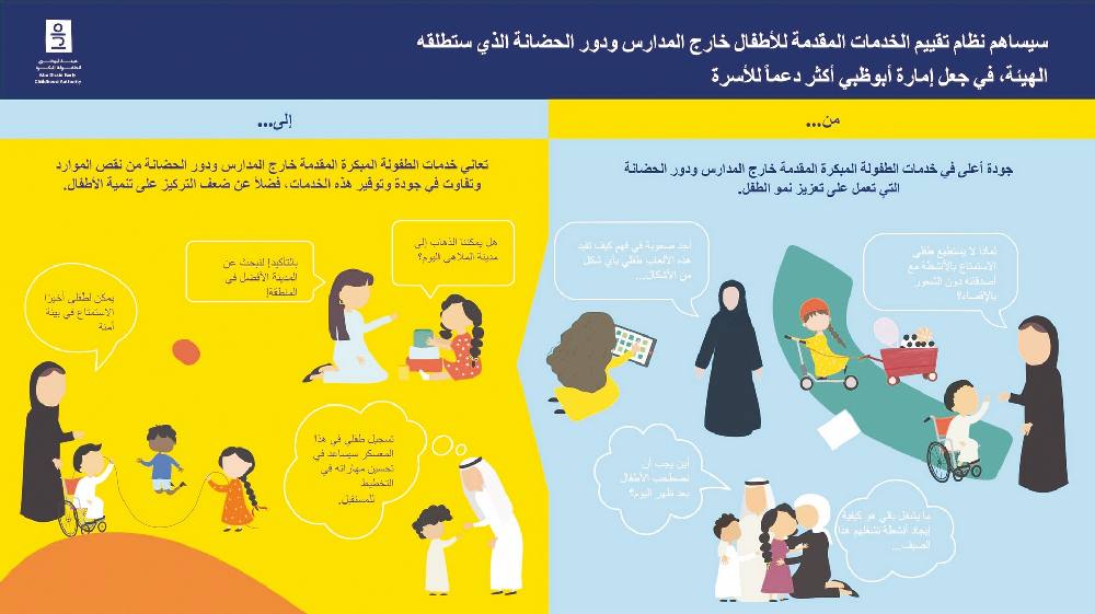 أعلنت هيئة أبوظبي للطفولة المبكرة، بمناسبة يوم الطفل الإماراتي الذي يصادف 15 مارس من كل عام، بدء العمل على تصميم نظام لتقييم جودة الخدمات المقدمة للأطفال الصغار خارج دور الحضانة والمدارس، ومن بينها المخيمات، وبرامج ما بعد المدرسة، ومكتبات الأطفال، والحدائق، والملاعب، ومتاحف الأطفال، والمراكز الثقافية التي تحتوي على مساحات مخصصة للأطفال، ومراكز الترفيه الأسري، وأماكن الألعاب، بهدف تقييم وتحسين الخدمات والبرامج المقدمة للأسر، وضمان توفير برامج وتجارب آمنة وفعالة وذات جودة عالية للأطفال في إمارة أبوظبي.