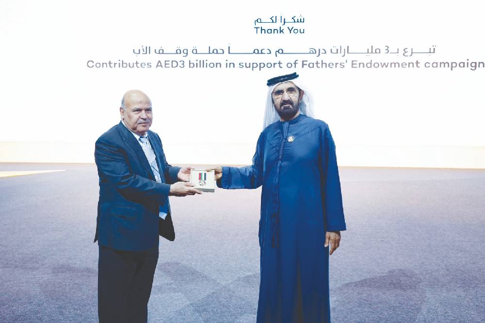 وكرم صاحب السمو الشيخ محمد بن راشد آل مكتوم، عدداً من كبار المساهمين في حملة “وقف الأب” بميدالية صاحب السمو الشيخ محمد بن راشد آل مكتوم للعمل الخيري، وهم: معالي سعيد محمد الطاير، العضو المنتدب الرئيس التنفيذي لهيئة كهرباء ومياه دبي، ومعالي عبدالله محمد البسطي، رئيس مجلس أمناء مؤسسة محمد بن راشد آل مكتوم للأعمال الخيرية والإنسانية، ومحمد جمعة النابودة، ومسيح امتياز، الرئيس التنفيذي لشركة “امتياز للتطوير العقاري”، وعمران فاروق الرئيس التنفيذي لشركة “سمانا للتطوير العقاري”، وإحسان رشيد الرئيس التنفيذي لشركة “بيس هوم”، ويوسف علي موسليام رئيس مجلس إدارة مجموعة اللولو العالمية، وسيدهارث بالاشاندران الرئيس والمدير التنفيذي لشركة “بيوميرك المحدودة”، وسعادة عبد الله مطر المناعي رئيس مجلس الإدارة العضو المنتدب لشركة الإمارات للمزادات، وعمر المناعي المدير التنفيذي للإمارات للمزادات، والدكتور عبدالله الغفلي مدير عام مركز النقل المتكامل بالإنابة، والعميد محمد البريك العامري المدير التنفيذي لقطاع ترخيص السائقين والمركبات، وأحمد محبوب المدير التنفيذي لمؤسسة الترخيص في هيئة الطرق والمواصلات وناريش بافناني رئيس مجلس إدارة مجموعة ويست زون.