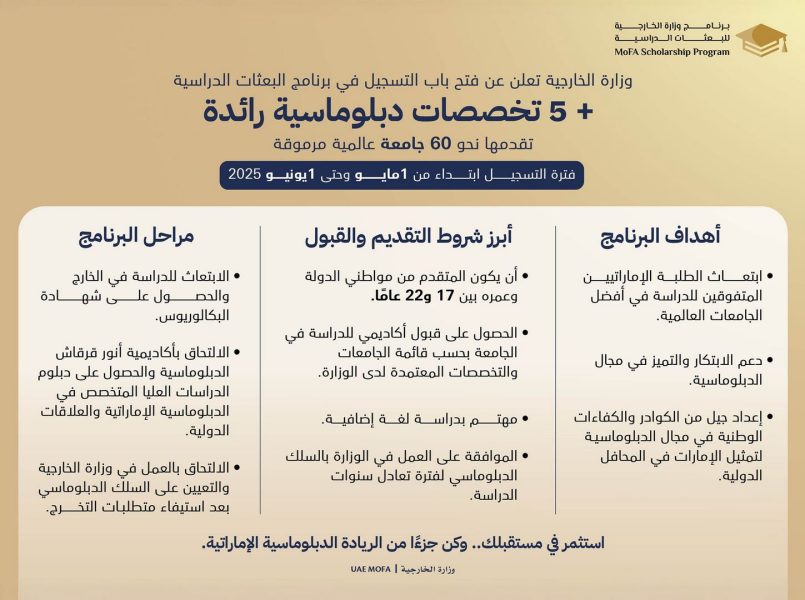 أعلنت وزارة الخارجية عن فتح باب التسجيل في النسخة الجديدة من برنامج البعثات الدراسية، وذلك ابتداء من الأول من مايو وحتى الأول من يونيو 2025؛ حيث يهدف البرنامج إلى ابتعاث الطلبة الإماراتيين المتفوقين لاستكمال دراستهم في 60 جامعة عالمية مرموقة، تقدم أكثر من خمسة تخصصات دبلوماسية رائدة، مما يسهم في ترسيخ ثقافة الابتكار والتميز في مجال الدبلوماسية، وتمكين الطلبة المبتعثين من تحقيق إنجازات -غير مسبوقة- في السلك الدبلوماسي، كذلك رفد الوزارة بكفاءات وطنية قادرة على ريادة وصناعة التغيير في السياسة الخارجية لدولة الإمارات والتأثير إيجابيا في الساحة الدولية.