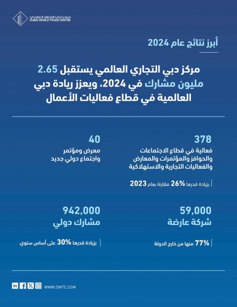 ونظّم مركز دبي التجاري العالمي 20 معرضاً وفعالية رئيسية في عام 2024، شارك فيها 590 ألف مشارك بزيادة سنوية قدرها 14%.