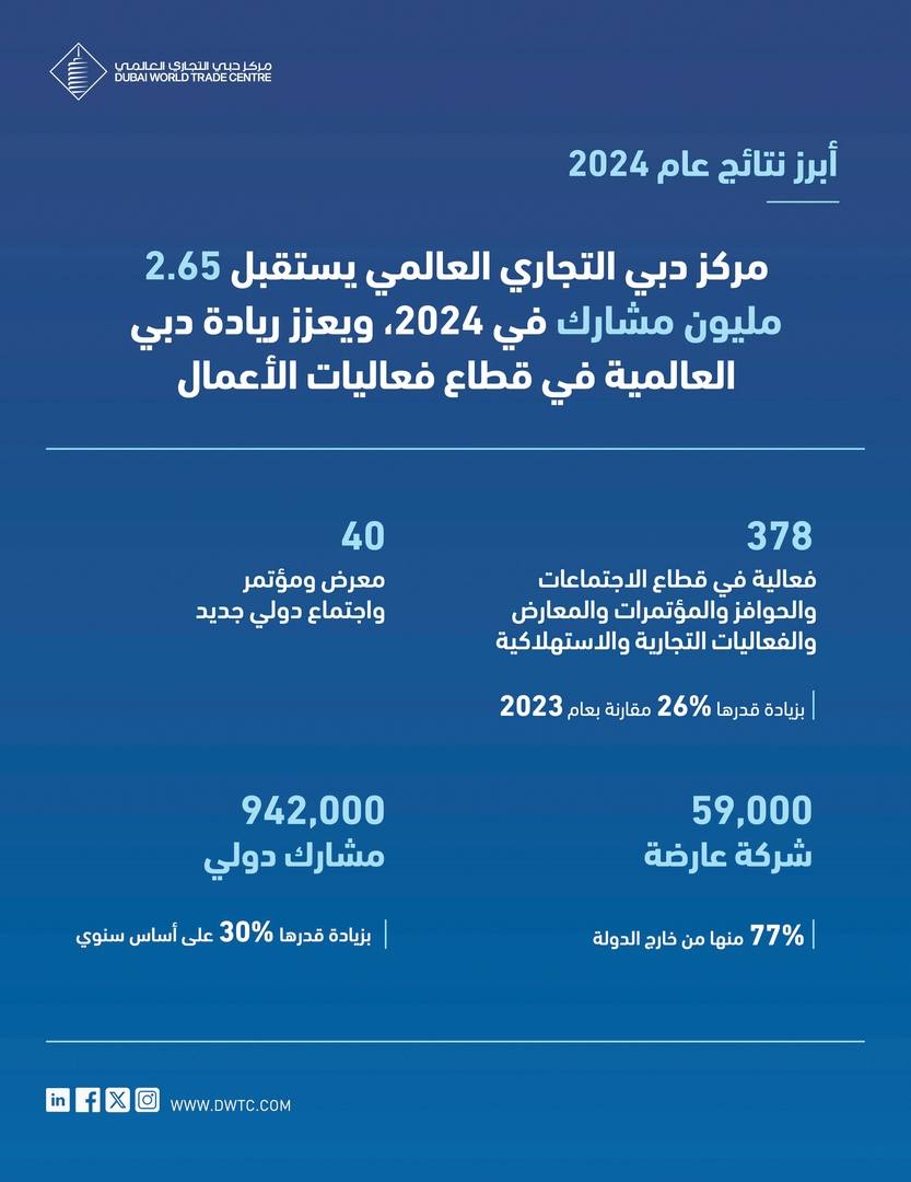 أعلن مركز دبي التجاري العالمي عن نتائجه لعام 2024 والتي كشفت استقبال المركز 2.65 مليون مشارك خلال عام 2024 محققاً زيادة بنسبة 7% مقارنة بعام 2023، وذلك بفضل جدول فعاليات حافل شمل 378 فعالية في قطاع الاجتماعات والحوافز والمؤتمرات والمعارض والفعاليات التجارية والاستهلاكية، مسجلاً نمواً بنسبة 26% مقارنة بالعام السابق.