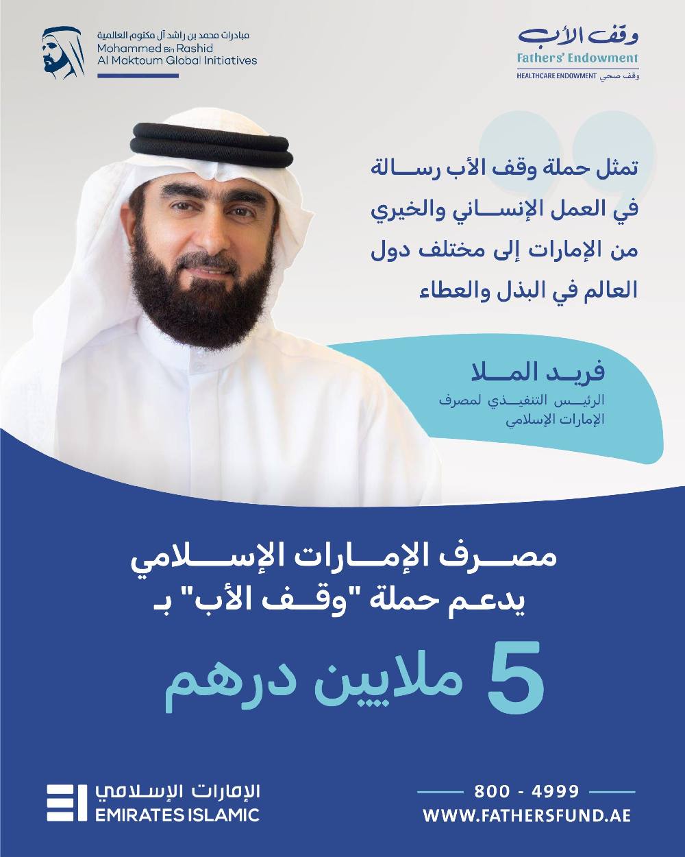 وقال فريد الملا الرئيس التنفيذي لمصرف الإمارات الإسلامي، إن حملة “وقف الأب” تمثل رسالة في العمل الإنساني والخيري من الإمارات إلى مختلف دول العالم، في البذل والعطاء من خلال تخصيص وقف مستدام يساعد المرضى في مختلف أنحاء العالم ويخفف عنهم آلامهم ومعاناتهم، ما يمنحهم الأمل بالاستقرار وتلبية احتياجاتهم الأساسية وفي مقدمتها الرعاية الصحية المستدامة.