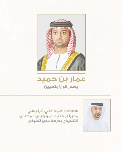 وبموجب القرار، تمت ترقية سعادة أحمد علي الرئيسي إلى درجة “مدير تنفيذي”، وتعيينه مديراً لمكتب سمو رئيس المجلس التنفيذي، وذلك وفقاً لأنظمة الموارد البشرية المعتمدة في حكومة عجمان.