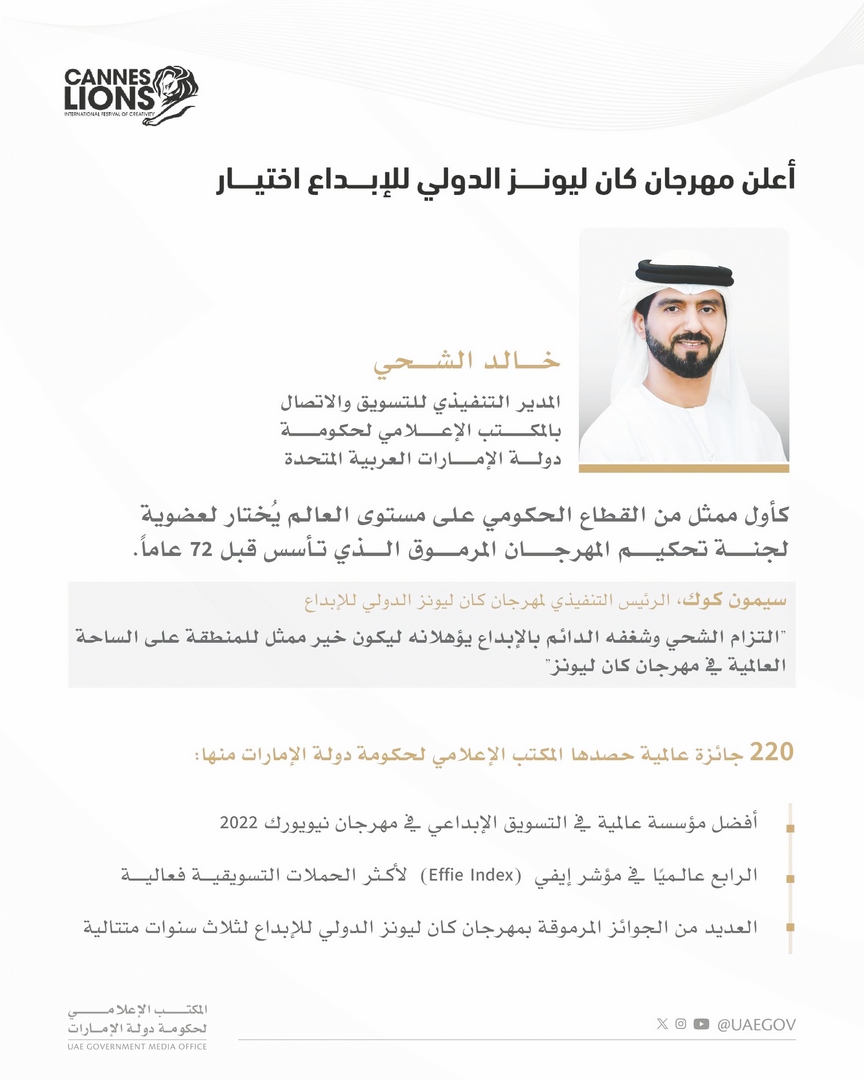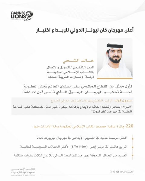 ويؤكد اختيار خالد الشحي لعضوية لجنة تحكيم “كان ليونز” التزام الدولة بالتميّز الإبداعي وتعزيز فعالية الاتصال الحكومي على الساحة الدولية.